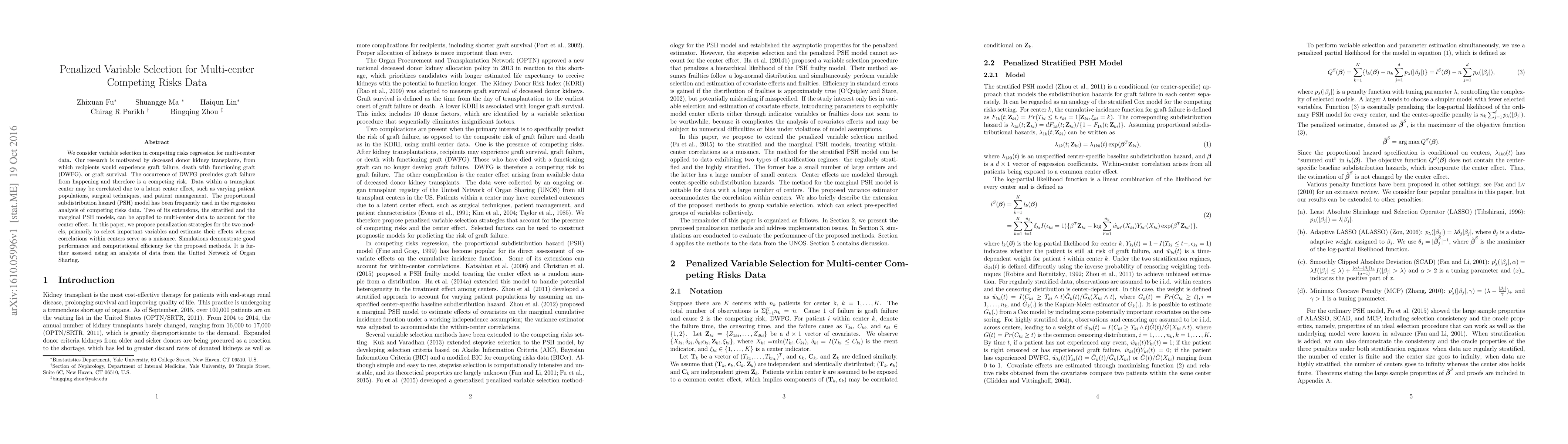 This paper proposes penalized variable selection strategies for competing risks regression in multi-center data, focusing on kidney transplant outcomes. The methods aim to account for center-specific effects while identifying significant variables, demonstrating good performance in simulations and real-world data analysis.