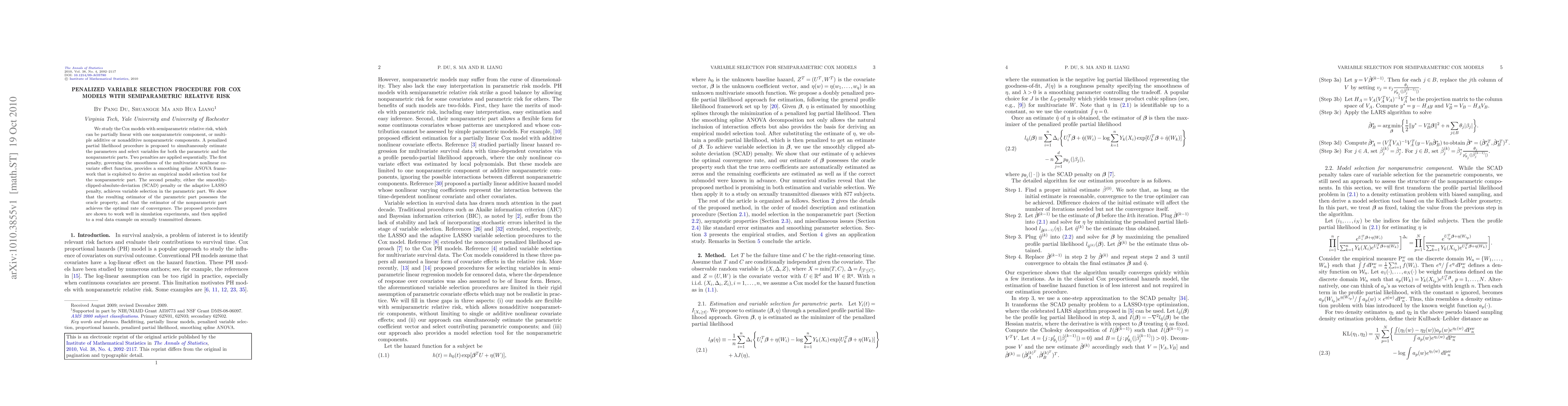 This paper proposes a penalized partial likelihood procedure for Cox models with semiparametric relative risk, utilizing sequential penalties for variable selection and parameter estimation. The method achieves optimal convergence rates and oracle properties, demonstrated through simulations and a real-data application on sexually transmitted diseases.