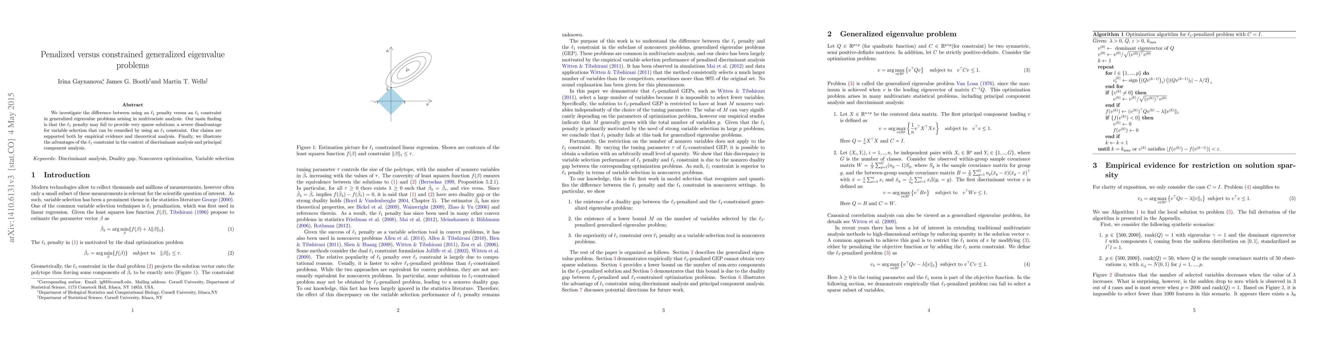 A new study compares $ell_1$ penalty vs $ell_1$ constraint in generalized eigenvalue problems, finding that the constraint provides more sparse solutions for variable selection.