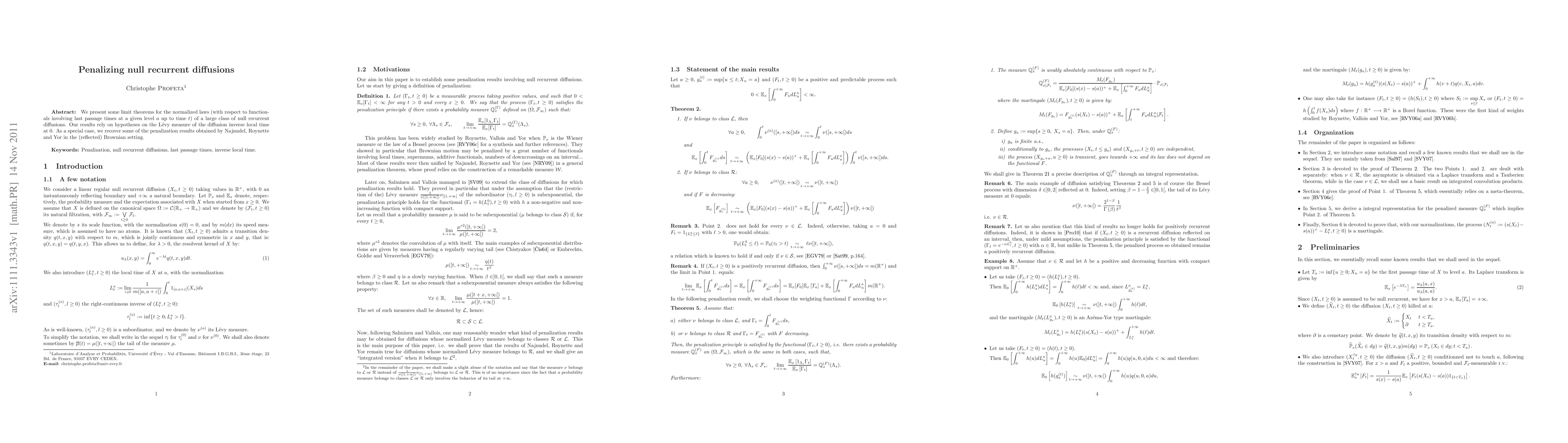 We present some limit theorems for the normalized laws (with respect to functionals involving last passage times at a given level up to time t) of a large class of null recurrent diffusions. Our results rely on hypotheses on the L\'evy measure of the diffusion inverse local time at 0. As a special case, we recover some of the penalization results obtained by Najnudel, Roynette and Yor in the (reflected) Brownian setting.