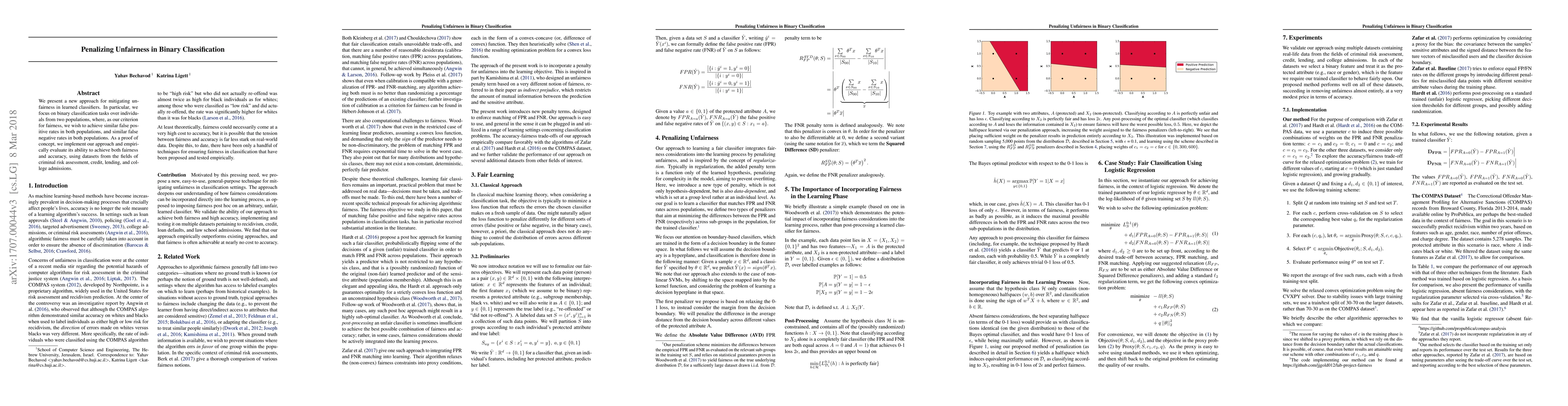 We present a new approach for mitigating unfairness in learned classifiers. In particular, we focus on binary classification tasks over individuals from two populations, where, as our criterion for fairness, we wish to achieve similar false positive rates in both populations, and similar false negative rates in both populations. As a proof of concept, we implement our approach and empirically evaluate its ability to achieve both fairness and accuracy, using datasets from the fields of criminal risk assessment, credit, lending, and college admissions.