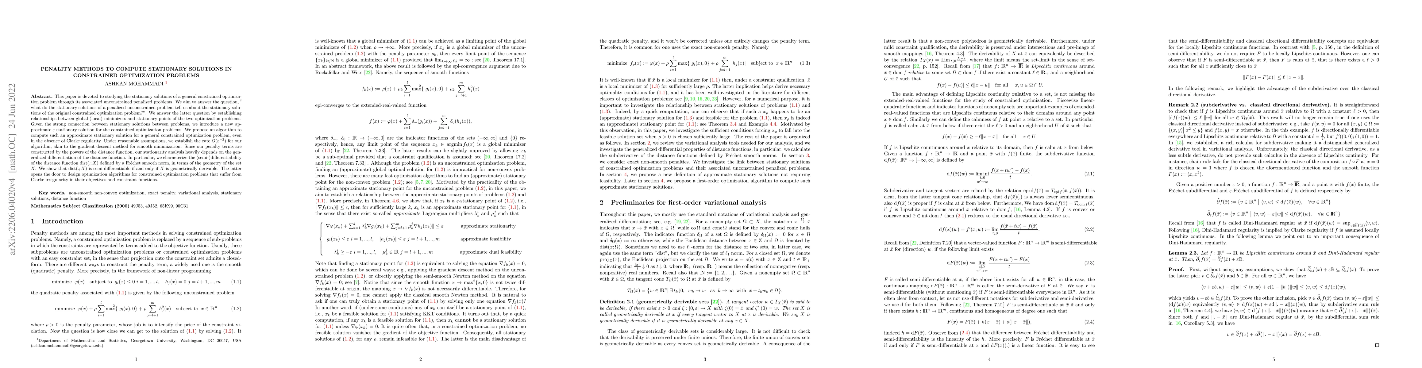 This paper explores the relationship between stationary solutions of penalized unconstrained problems and the original constrained optimization problems, proposing an algorithm to compute approximate $\varepsilon$-stationary solutions. It establishes an $O(\varepsilon^{-2})$ rate of convergence and characterizes the semi-differentiability of the distance function to handle Clarke irregularity.