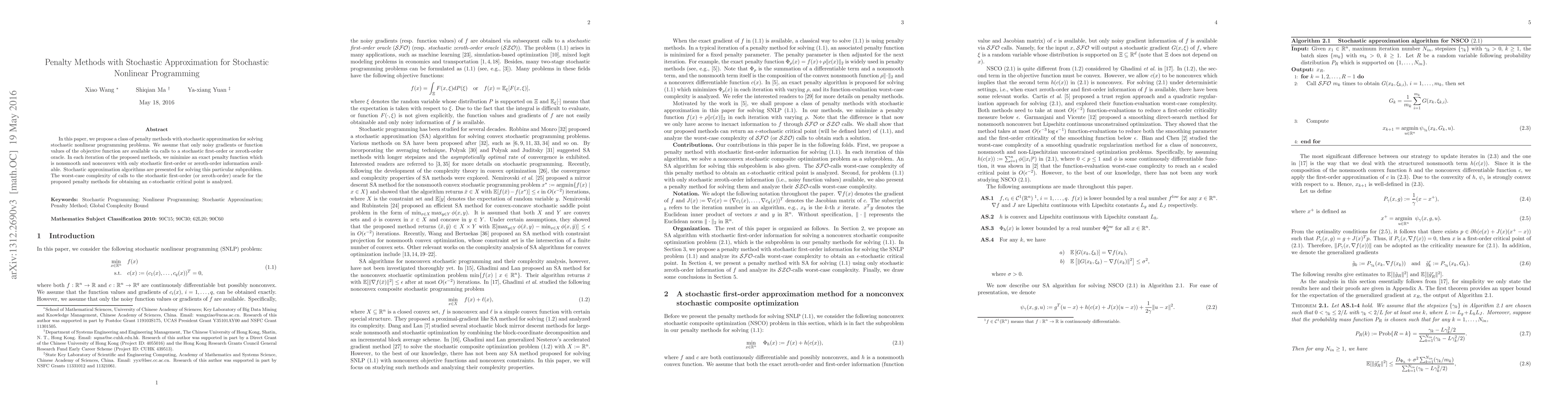 This paper introduces penalty methods with stochastic approximation for solving stochastic nonlinear programming problems, utilizing noisy gradient or function value estimates. It analyzes the complexity of the proposed methods for achieving an $\epsilon$-stochastic critical point.
