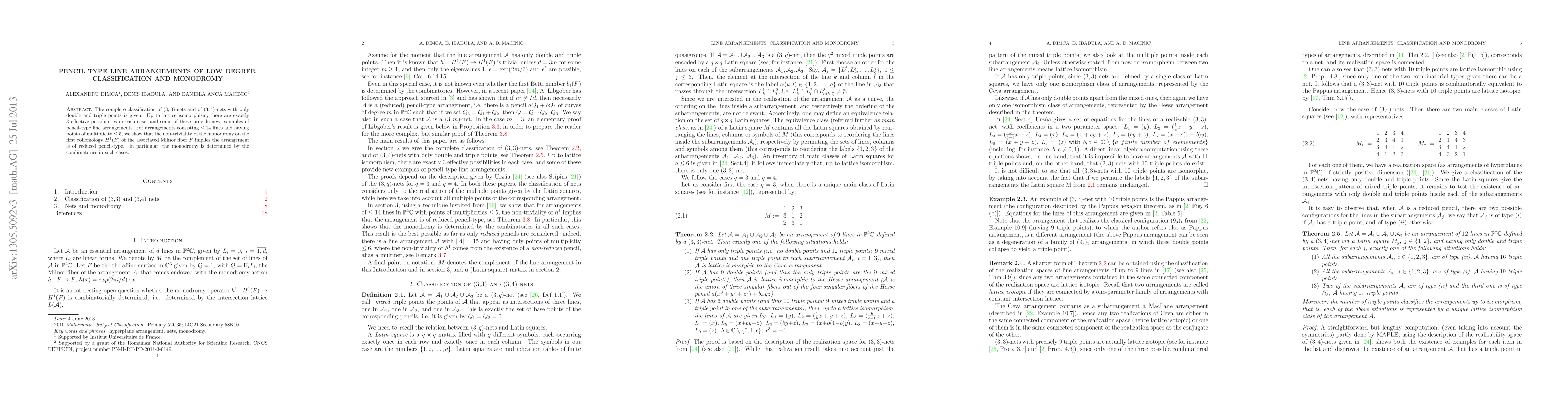 This paper classifies (3,3)-nets and (3,4)-nets with only double and triple points, finding exactly three effective possibilities for each. It also demonstrates that for pencil-type line arrangements with up to 14 lines and points of multiplicity at most 5, non-trivial monodromy on the first cohomology implies the arrangement is of reduced pencil-type, with monodromy determined by combinatorics.