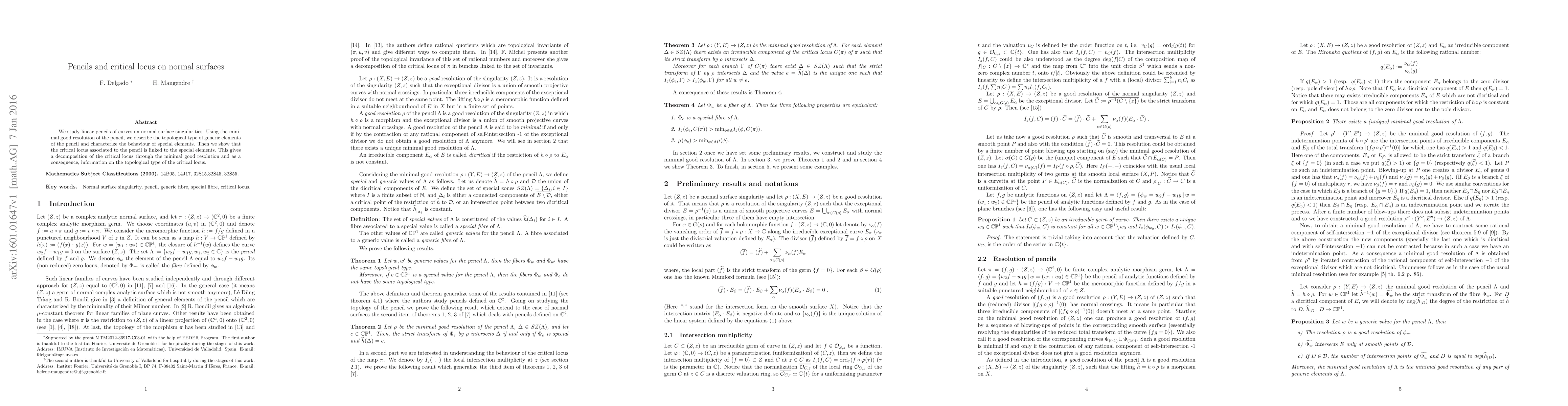 We study linear pencils of curves on normal surface singularities. Using the minimal good resolution of the pencil, we describe the topological type of generic elements of the pencil and characterize the behaviour of special elements. Then we show that the critical locus associated to the pencil is linked to the special elements. This gives a decomposition of the critical locus through the minimal good resolution and as a consequence, information on the topological type of the critical locus.