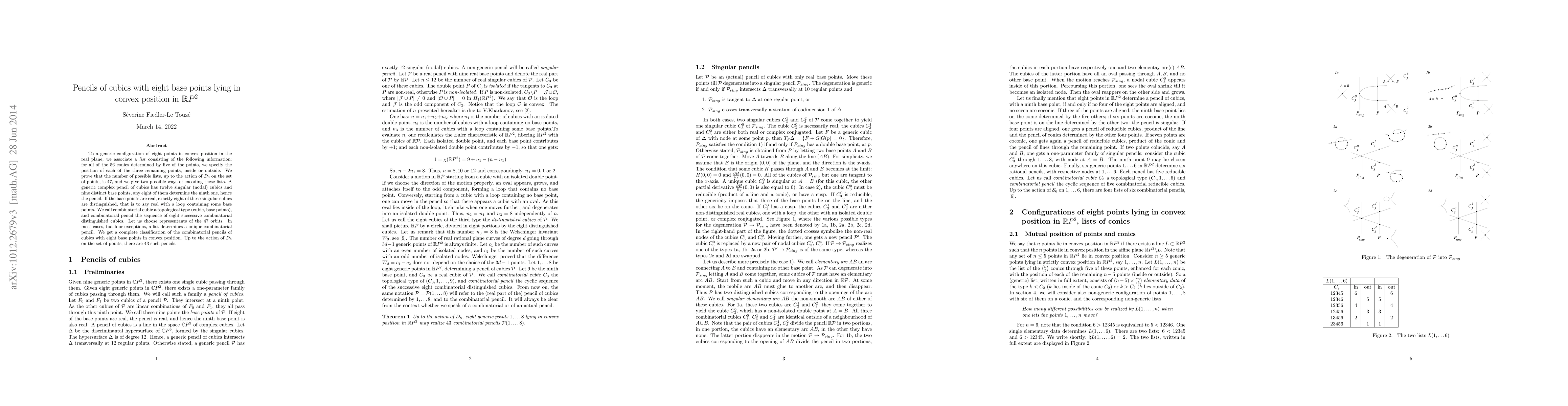 To a generic configuration of eight points in convex position in the plane, we associate a list consisting of the following information: for all of the 56 conics determined by five of the points, we specify the position of each remaining point, inside or outside. We prove that the number of possible lists, up to the action of $D_8$ on the set of points, is 47, and we give two possible ways of encoding these lists. A generic compex pencil of cubics has twelve singular (nodal) cubics and nine distinct base points, any eight of them determine the ninth one, hence the pencil. If the base points are real, exactly eight of these singular cubics are distinguished, that is to say real with a loop containing some base points. We call combinatorial cubic a topological type (cubic, base points), and combinatorial pencil the sequence of eight successive combinatorial distinguished cubics. Let us choose representants of the 47 orbits. In most cases, but four exceptions, a list determines a unique combinatorial pencil. We give a complete classification of the combinatorial pencils of cubics with eight base points in convex position. Up to the action of $D_8$ on the set of points, there are $43$ such pencils.