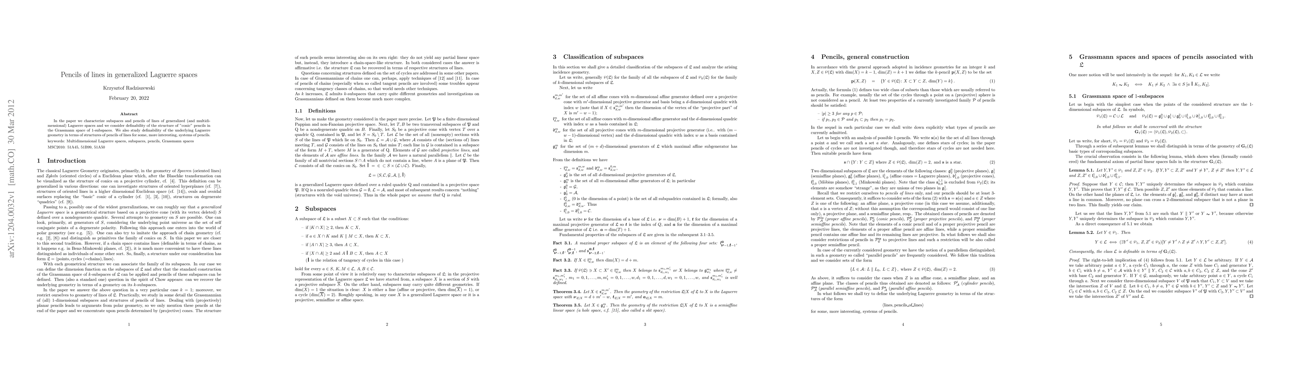 In the paper we characterize subspaces and pencils of lines of generalized (and multidimensional) Laguerre spaces and we consider definability of the structure of "conic" pencils in the Grassmann space of 1-subspaces. We also study definability of the underlying Laguerre geometry in terms of structures of pencils of lines for some, more interesting, systems of pencils.