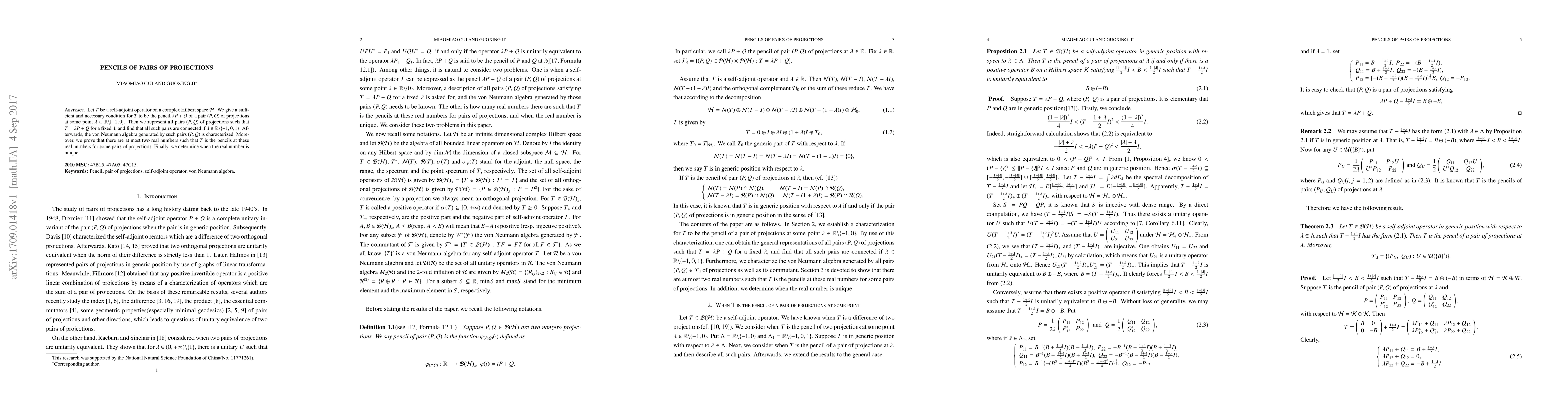 Let $T$ be a self-adjoint operator on a complex Hilbert space $\mathcal{H}$. We give a sufficient and necessary condition for $T$ to be the pencil $\lambda P+Q$ of a pair $( P, Q)$ of projections at some point $\lambda\in\mathbb{R}\backslash\{-1, 0\}$. Then we represent all pairs $(P, Q)$ of projections such that $T=\lambda P+Q$ for a fixed $\lambda$, and find that all such pairs are connected if $\lambda\in\mathbb{R}\backslash\{-1, 0, 1\}$. Afterwards, the von Neumann algebra generated by such pairs $(P,Q)$ is characterized. Moreover, we prove that there are at most two real numbers such that $T$ is the pencils at these real numbers for some pairs of projections. Finally, we determine when the real number is unique.