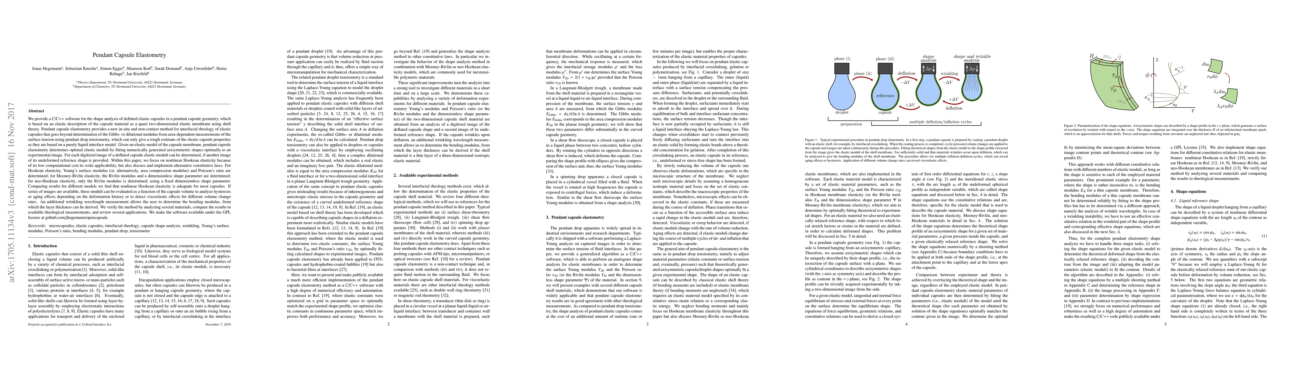 We provide a C/C++ software for the shape analysis of deflated elastic capsules in a pendant capsule geometry, which is based on an elastic description of the capsule material as a quasi two-dimensional elastic membrane using shell theory. Pendant capsule elastometry provides a new in-situ and non-contact method for interfacial rheology of elastic capsules. Given an elastic model of the capsule membrane, pendant capsule elastometry determines optimal elastic moduli by fitting numerically generated axisymmetric shapes optimally to an experimental image. For each digitized image of a deflated capsule elastic moduli can be determined, if another image of its undeformed reference shape is provided. Within this paper, we focus on nonlinear Hookean elasticity because of its low computational cost its wide applicability, but also discuss and implement alternative constitutive laws. For Hookean elasticity, Young's surface modulus (or, alternatively, area compression modulus) and Poisson's ratio are determined; for Mooney-Rivlin elasticity, the Rivlin modulus and a dimensionless shape parameter are determined; for neo-Hookean elasticity, only the Rivlin modulus is determined, using a fixed dimensionless shape parameter. Comparing results for different models we find that nonlinear Hookean elasticity is adequate for most capsules. If series of images are available, these moduli can be evaluated as a function of the capsule volume to analyze hysteresis or aging effects depending on the deformation history. An additional wrinkling wavelength measurement allows the user to determine the bending modulus, from which the layer thickness can be derived. We verify the method by analyzing several materials, compare the results to available rheological measurements, and review several applications. We make the software available under the GPL license at github.com/jhegemann/opencapsule.