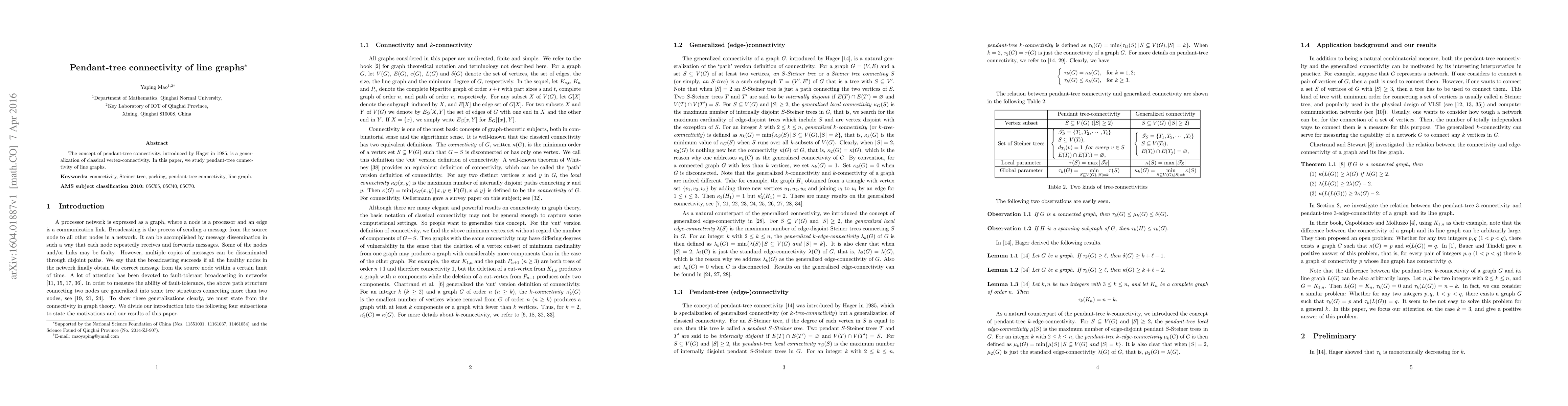Summary: This paper investigates the concept of pendant-tree connectivity, a generalization of vertex-connectivity, specifically within the context of line graphs, expanding on the foundational work introduced by Hager in 1985.