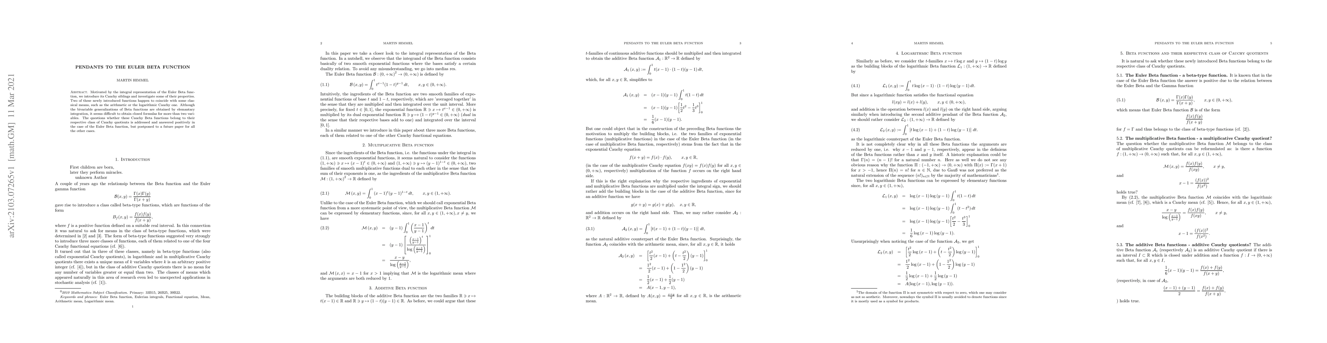 Motivated by the integral representation of the Euler Beta function, we introduce its Cauchy siblings and investigate some of their properties. Two of these newly introduced functions happen to coincide with some classical means, such as the arithmetic or the logarithmic Cauchy one. Although the bivariable generalizations of Beta functions are obtained by elemantary integration, it seems difficult to obtain closed formulas for more than two variables. % The questions whether these Cauchy Beta functions belong to their respective class of Cauchy quotients is addressed and answered positively in the case of the Euler Beta function, but postponed to a future paper for all the other cases.