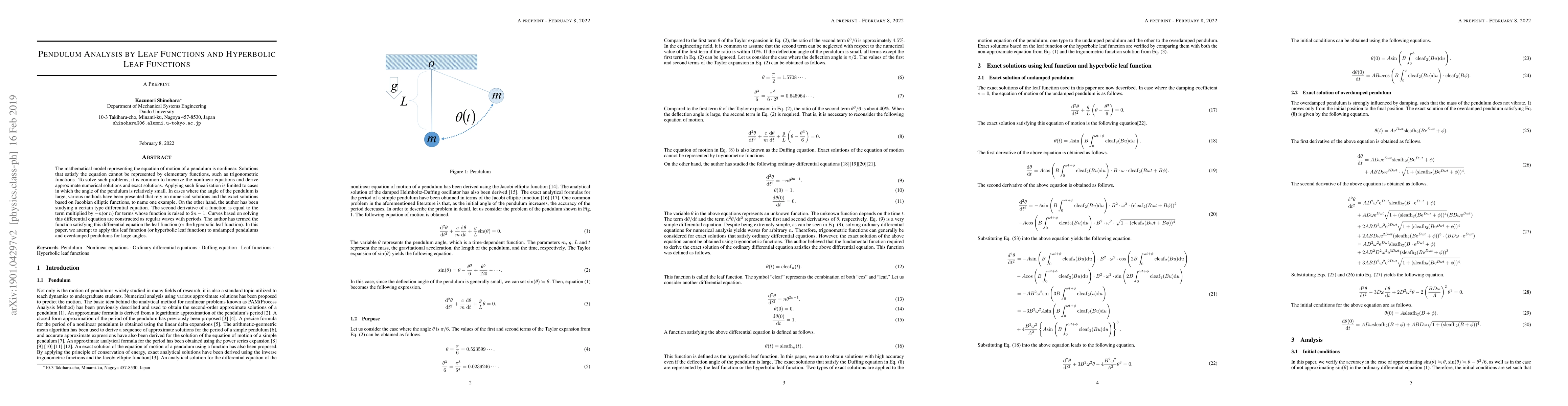 The mathematical model representing the equation of motion of a pendulum is nonlinear. Solutions that satisfy the equation cannot be represented by elementary functions, such as trigonometric functions. To solve such problems, it is common to linearize the nonlinear equations and derive approximate numerical solutions and exact solutions. Applying such linearization is limited to cases in which the angle of the pendulum is relatively small. In cases where the angle of the pendulum is large, various methods have been presented that rely on numerical solutions and the exact solutions based on Jacobian elliptic functions, to name one example. On the other hand, the author has been studying a certain type differential equation. The second derivative of a function is equal to the term multiplied by $-n$(or $n$) for terms whose function is raised to $2n-1$. Curves based on solving this differential equation are constructed as regular waves with periods. The author has termed the function satisfying this differential equation the leaf function (or the hyperbolic leaf function). In this paper, we attempt to apply this leaf function (or hyperbolic leaf function) to undamped pendulums and overdamped pendulums for large angles.
