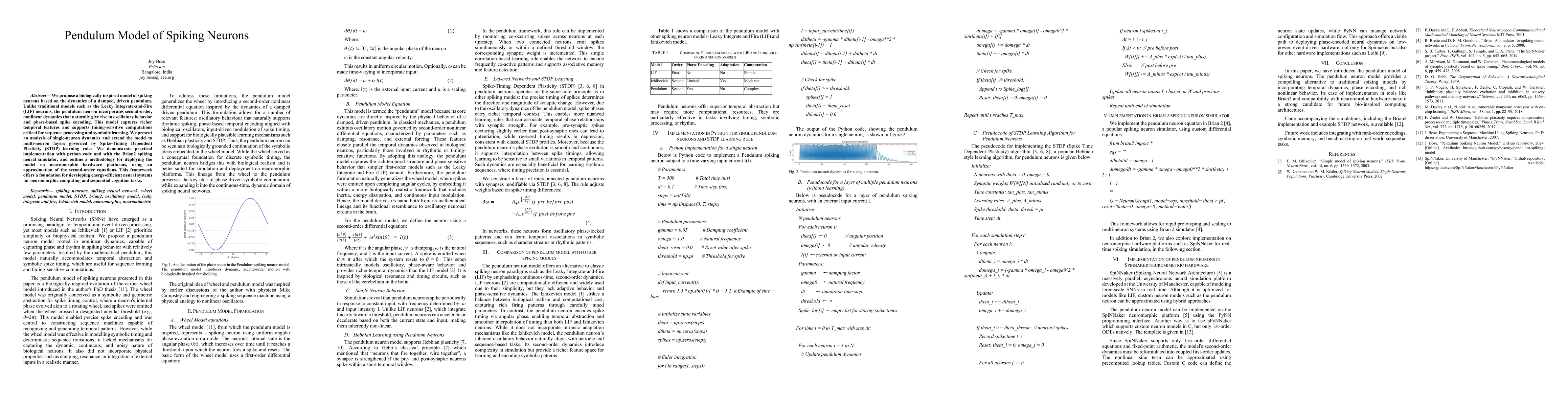 We propose a biologically inspired model of spiking neurons based on the dynamics of a damped, driven pendulum. Unlike traditional models such as the Leaky Integrate-and-Fire (LIF) neurons, the pendulum neuron incorporates second-order, nonlinear dynamics that naturally give rise to oscillatory behavior and phase-based spike encoding. This model captures richer temporal features and supports timing-sensitive computations critical for sequence processing and symbolic learning. We present an analysis of single-neuron dynamics and extend the model to multi-neuron layers governed by Spike-Timing Dependent Plasticity (STDP) learning rules. We demonstrate practical implementation with python code and with the Brian2 spiking neural simulator, and outline a methodology for deploying the model on neuromorphic hardware platforms, using an approximation of the second-order equations. This framework offers a foundation for developing energy-efficient neural systems for neuromorphic computing and sequential cognition tasks.