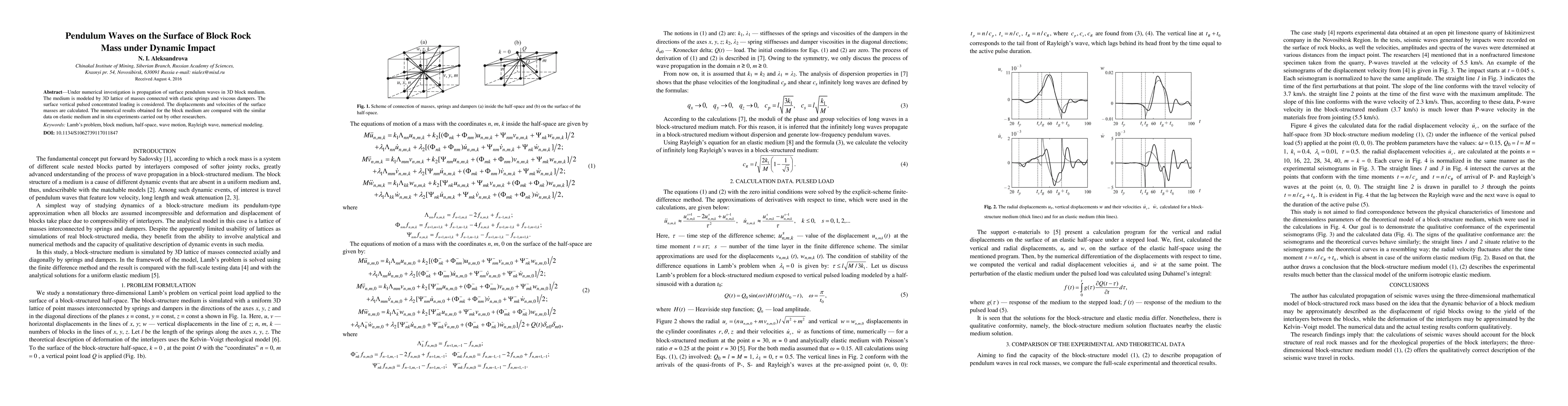 This research numerically investigates the propagation of surface pendulum waves in a 3D block medium, using a lattice model with masses, elastic springs, and dampers. The study compares these results with those from an elastic medium and existing in-situ experiments, providing insights into wave behavior under dynamic impact.