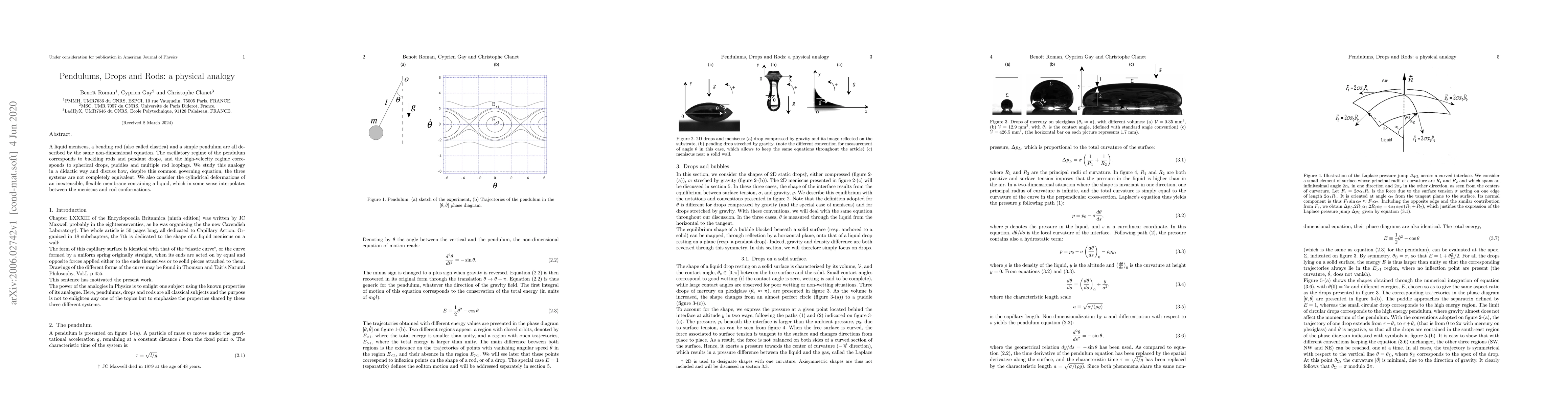 A liquid meniscus, a bending rod (also called elastica) and a simple pendulum are all described by the same non-dimensional equation. The oscillatory regime of the pendulum corresponds to buckling rods and pendant drops, and the high-velocity regime corresponds to spherical drops, puddles and multiple rod loopings. We study this analogy in a didactic way and discuss how, despite this common governing equation, the three systems are not completely equivalent. We also consider the cylindrical deformations of an inextensible, flexible membrane containing a liquid, which in some sense interpolates between the meniscus and rod conformations.
