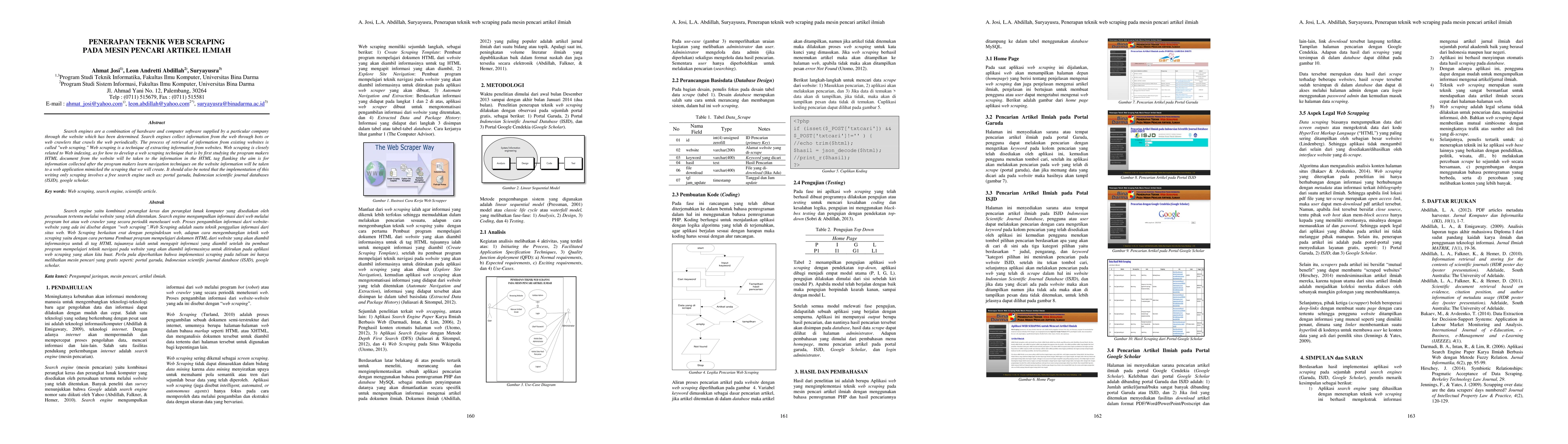 This paper explores the application of web scraping techniques to extract information from various scientific article search engines, including portal garuda, Indonesian scientific journal databases, and Google Scholar. The study focuses on developing web scraping techniques by analyzing HTML documents and mimicking web application navigation to gather targeted information.