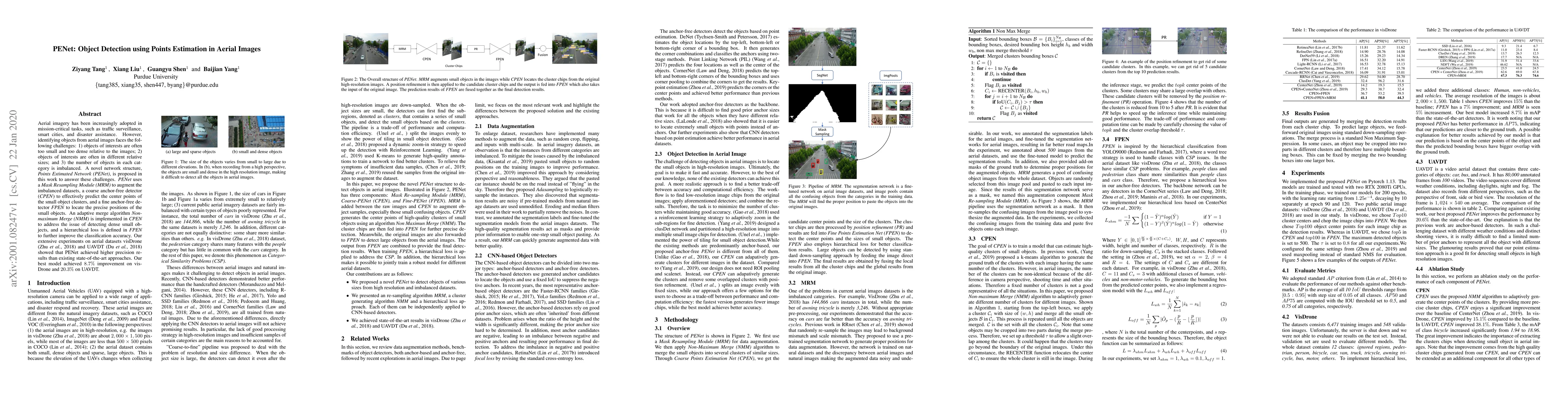 PENet, comprising Mask Resampling Module (MRM), Coarse Points Estimation Net (CPEN), and Fine Points Estimation Net (FPEN), is proposed for object detection in aerial images. MRM augments small objects using a fine-tuned segmentation network, CPEN estimates high-quality clusters of small objects with Non-Maximum Merge (NMM), and FPEN refines positions and improves classification accuracy with hierarchical loss.