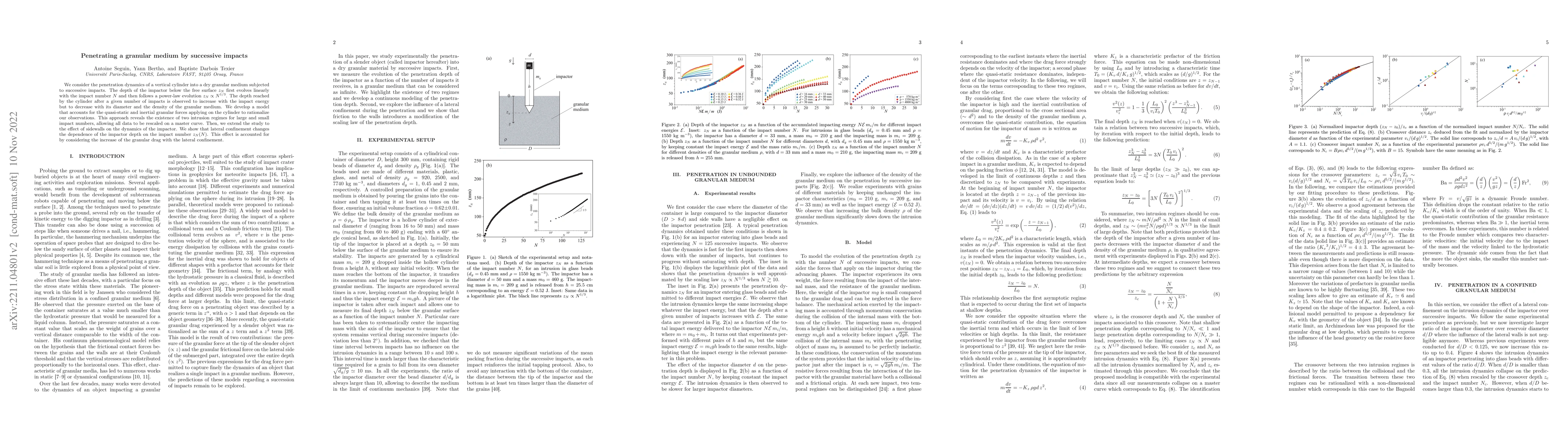 This paper investigates the penetration dynamics of a vertical cylinder into a dry granular medium under successive impacts, revealing two intrusion regimes. The study finds that the penetration depth follows a power-law evolution and is influenced by impact energy, cylinder diameter, and the medium's density, with a model developed to rationalize these observations.