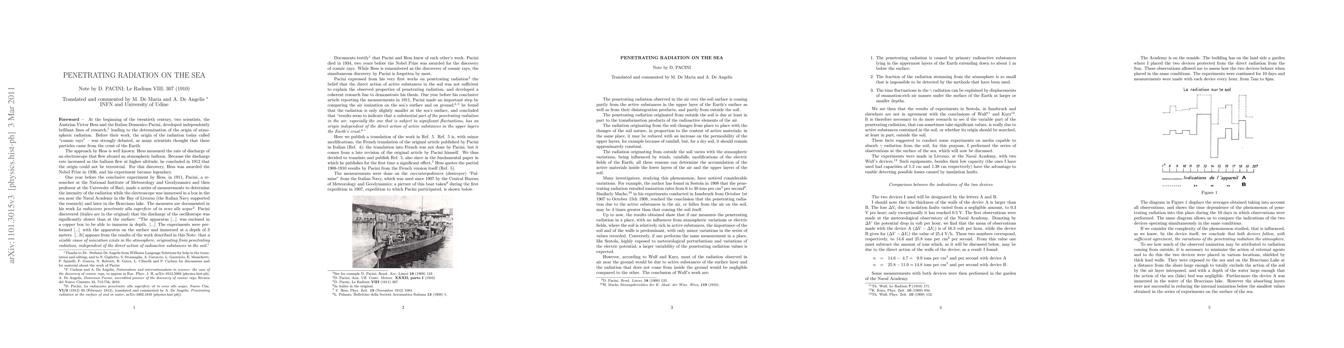 At the beginning of the twentieth century, two scientists, the Austrian Victor Hess and the Italian Domenico Pacini, developed two brilliant lines of research independently, leading to the determination of the origin of atmospheric radiation. Hess measured the rate of discharge of an electroscope that flew aboard an atmospheric balloon. Because the discharge rate increased as the balloon flew at higher altitude, he concluded in 1912 that the origin could not be terrestrial. For this discovery, Hess was awarded the Nobel Prize in 1936, and his experiment became legendary. At the same time, in 1911, Pacini, a professor at the University of Bari, made a series of measurements to determine the variation in the speed of discharge of an electroscope (and thus the intensity of the radiation) while the electroscope was immersed in a box in a sea near the Naval Academy in the Bay of Livorno (the Italian Navy supported the research). Pacini discovered that the discharge of the oscilloscope was significantly slower than at the surface. Before his conclusive measurements, Pacini performed a series of experiments between 1907 and 1910, in particular by comparing radioactivity on ground and on the sea surface a few kilometers off the coast. These experimennts gave marginal indications on the presence of a non-terrestrial component, encouraging Pacini to continue his research till the conclusive results. Such first experiments on the sea are presented in the article by D. Pacini in Le Radium VIII (1911) 307, which is essentially a translation into French of another article published in Italian in Ann. Uff. Centr. Meteor. XXXII, parte I (1910); this is a translation in English of the article by Pacini in "Le Radium", article which was quoted by Hess in his famous paper.