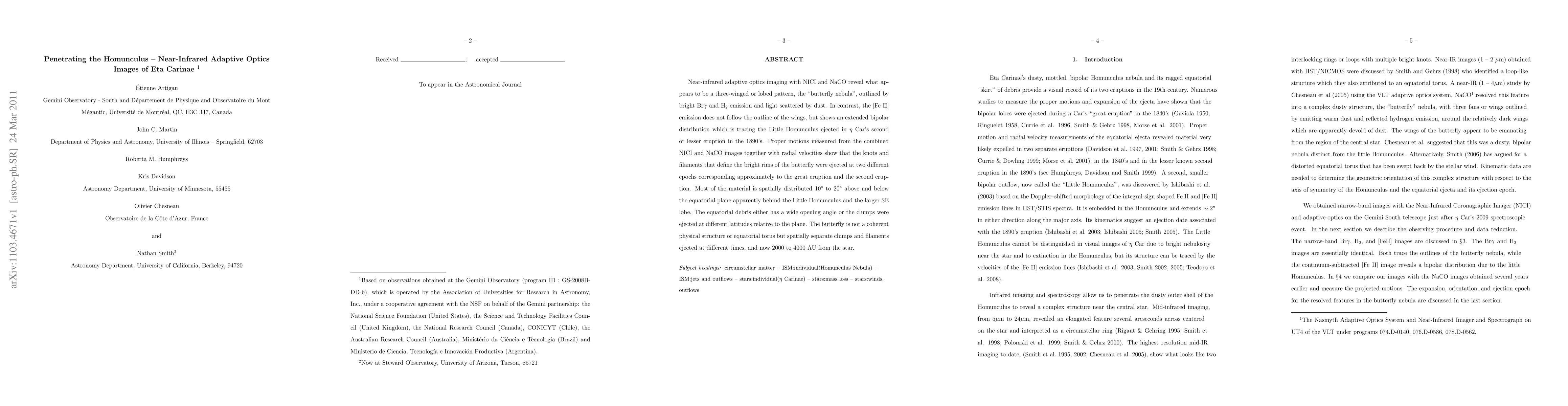 Near-infrared adaptive optics imaging of Eta Carinae reveals a three-winged "butterfly nebula" formed by bright Brγ and H₂ emission, while [Fe II] emission traces the Little Homunculus from the 1890s eruption. The bright rims of the butterfly consist of spatially separate clumps ejected during the great and second eruptions.