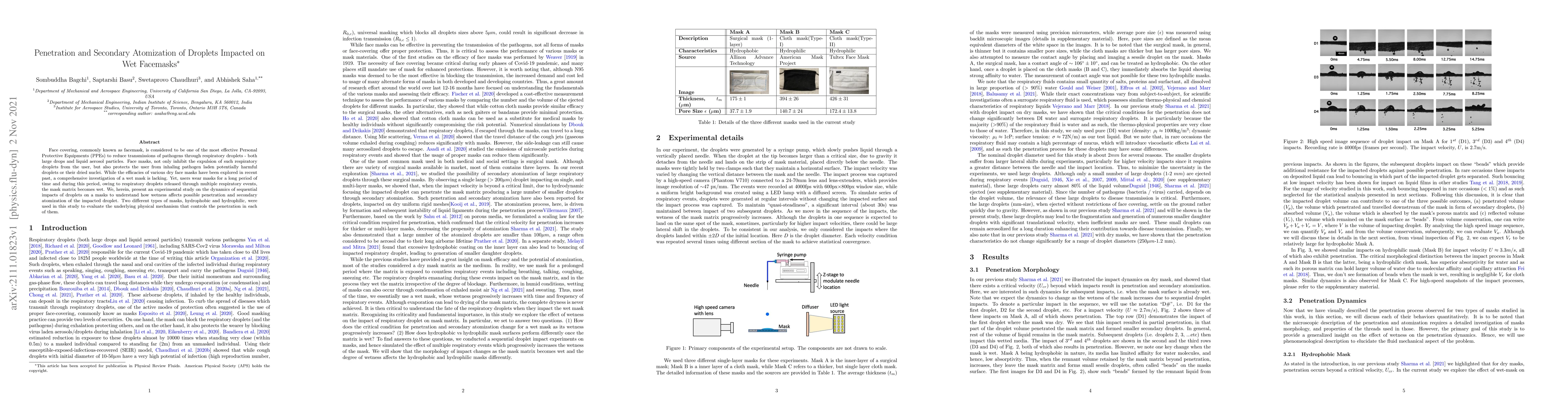 This study experimentally investigates how wetness affects the penetration and secondary atomization of respiratory droplets impacting two types of facemasks—hydrophobic and hydrophilic—to understand the dynamics of droplet behavior on wet masks. The findings aim to enhance the efficacy of facemasks in real-world conditions where masks become wet over time.