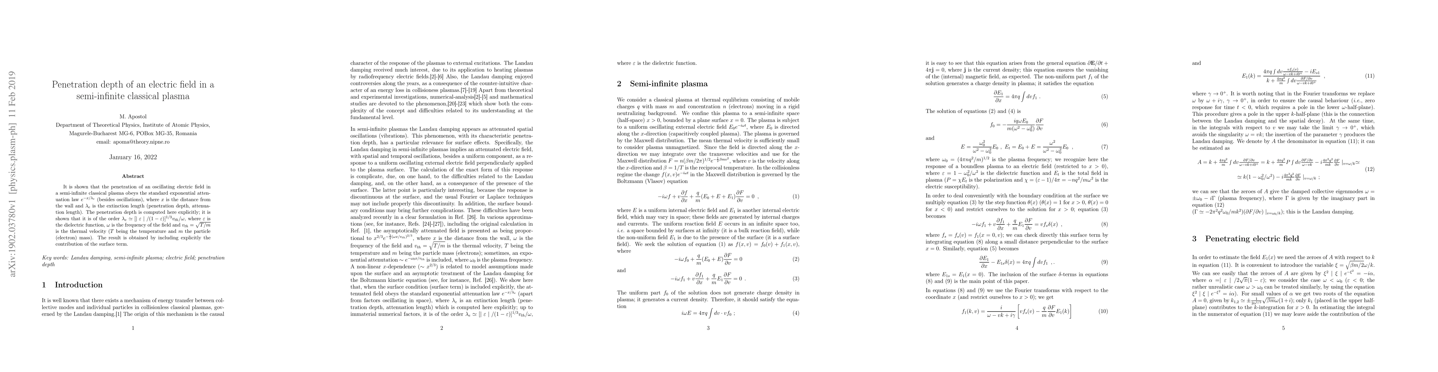 The paper presents a comprehensive analysis of electric field penetration in plasmas, explicitly including the surface term and deriving the penetration depth formula, which extends previous work on plasma oscillations and Landau damping.