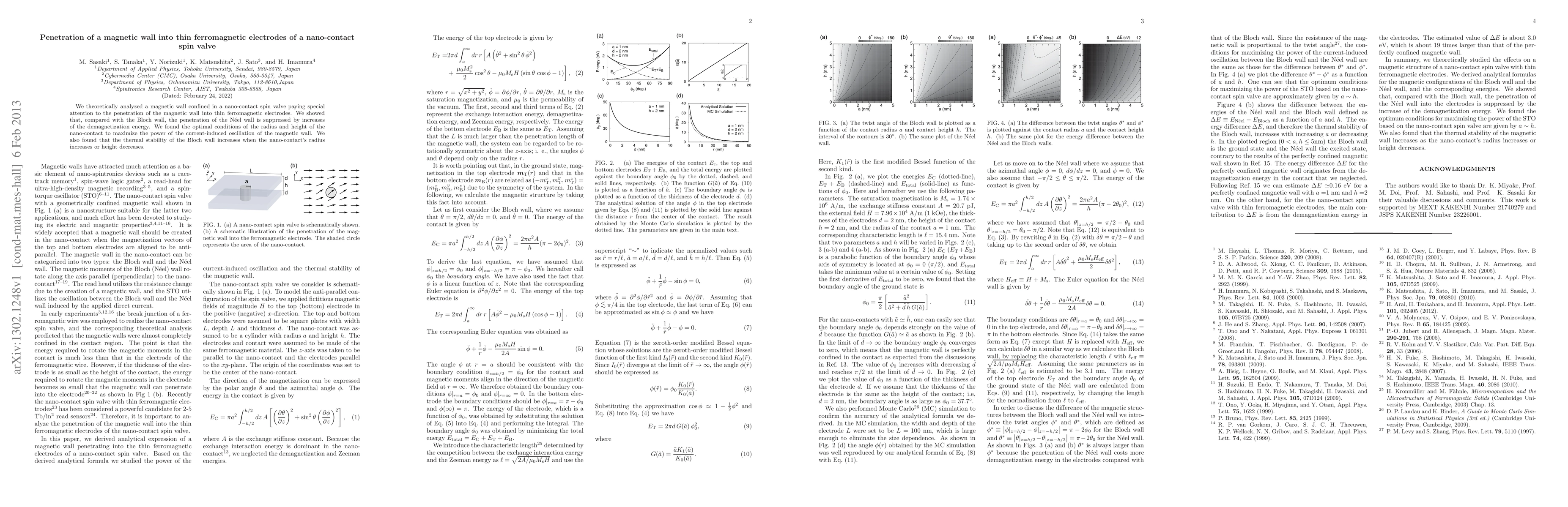 We theoretically analyzed a magnetic wall confined in a nano-contact spin valve paying special attention to the penetration of the magnetic wall into thin ferromagnetic electrodes. We showed that, compared with the Bloch wall, the penetration of the Neel wall is suppressed by increases of the demagnetization energy. We found the optimal conditions of the radius and height of the nano-contact to maximize the power of the current-induced oscillation of the magnetic wall. We also found that the thermal stability of the Bloch wall increases when the nano-contact's radius increases or height decreases.