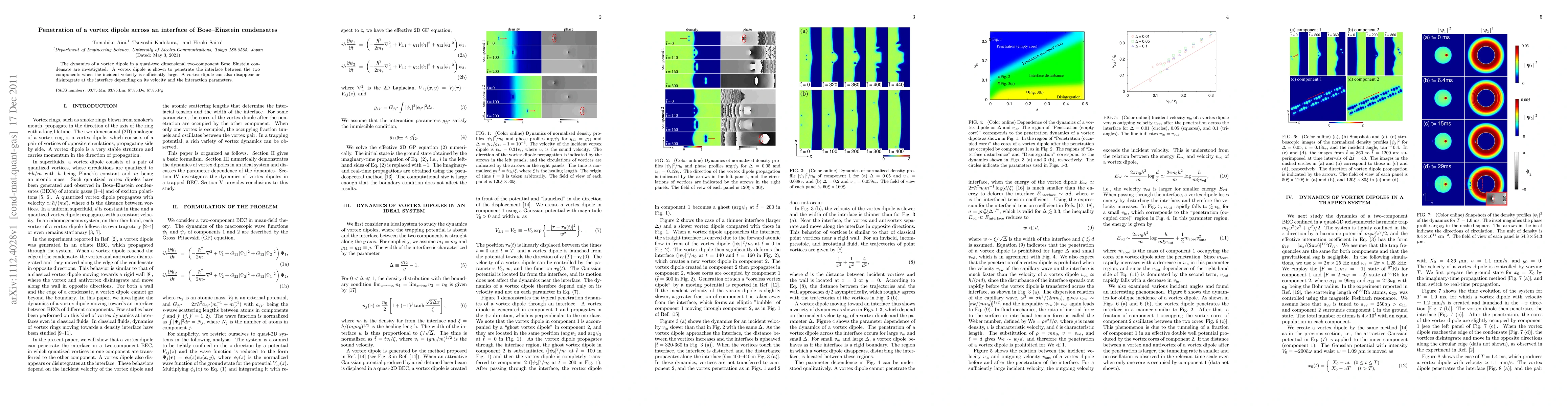 Summary: This study investigates the dynamics of a vortex dipole in a two-component Bose-Einstein condensate, revealing that it can penetrate the interface at high velocities, while also potentially disintegrating based on its velocity and interaction parameters.