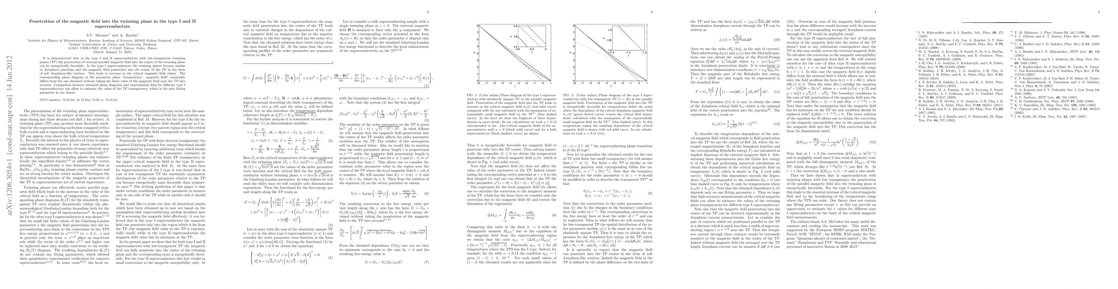 This paper demonstrates that in type I and II superconductors, the penetration of an external magnetic field into low-transparent twinning planes can be energetically favorable, leading to increased critical magnetic field values and altering the temperature-magnetic field phase diagram. Type I superconductors exhibit Josephson-like vortex behavior near these planes.