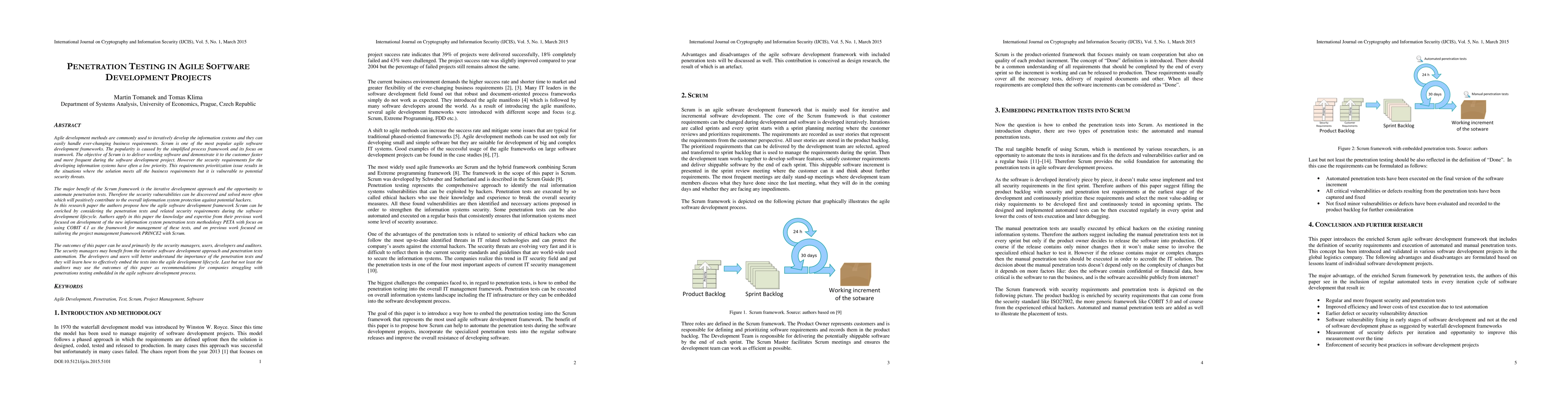 This paper explores integrating penetration testing into Scrum, an agile software development framework, to enhance security. The authors propose enriching Scrum by incorporating security requirements and automated penetration tests during the iterative development process, leveraging their prior work on a penetration testing methodology and project management frameworks.