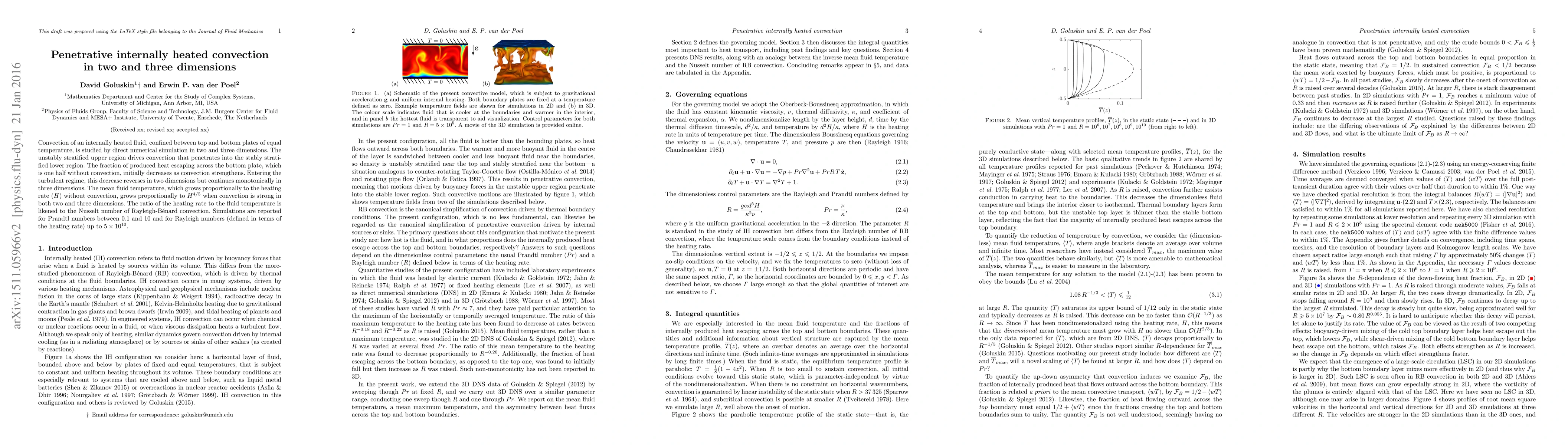 Convection of an internally heated fluid, confined between top and bottom plates of equal temperature, is studied by direct numerical simulation in two and three dimensions. The unstably stratified upper region drives convection that penetrates into the stably stratified lower region. The fraction of produced heat escaping across the bottom plate, which is one half without convection, initially decreases as convection strengthens. Entering the turbulent regime, this decrease reverses in two dimensions but continues monotonically in three dimensions. The mean fluid temperature, which grows proportionally to the heating rate ($H$) without convection, grows proportionally to $H^{4/5}$ when convection is strong in both two and three dimensions. The ratio of the heating rate to the fluid temperature is likened to the Nusselt number of Rayleigh-B\'enard convection. Simulations are reported for Prandtl numbers between 0.1 and 10 and for Rayleigh numbers (defined in terms of the heating rate) up to $5\times10^{10}$.