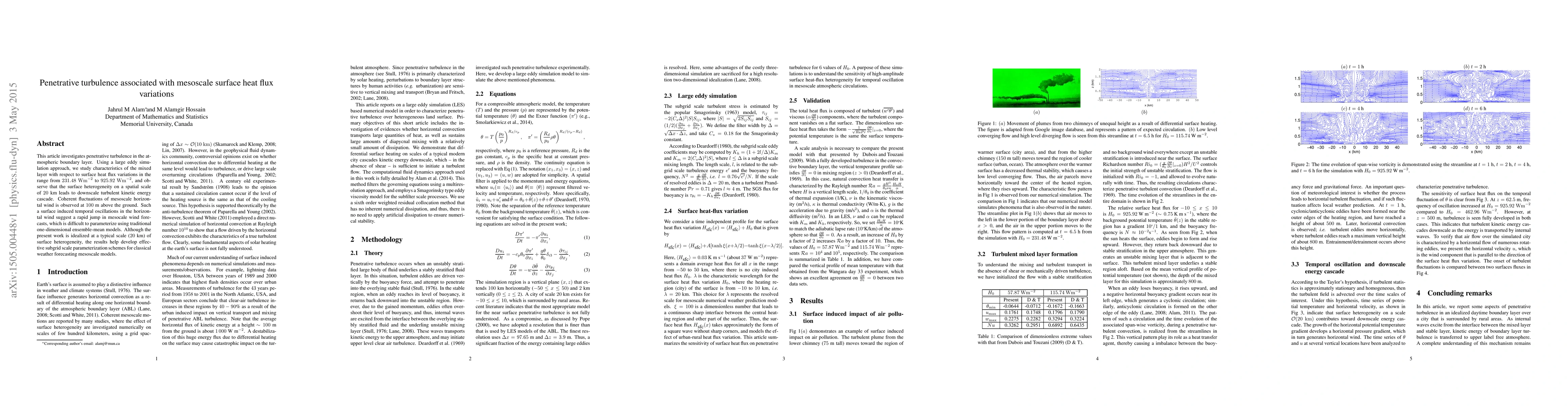 This article investigates penetrative turbulence in the atmospheric boundary layer. Using a large eddy simulation approach, we study characteristics of the mixed layer with respect to surface heat flux variations in the range from 231.48 W/m$^2$ to 925.92 W/m$^2$, and observe that the surface heterogeneity on a spatial scale of $20$ km leads to downscale turbulent kinetic energy cascade. Coherent fluctuations of mesoscale horizontal wind is observed at 100m above the ground. Such a surface induced temporal oscillations in the horizontal wind suggest a rapid jump in mesocale wind forecasts, which is difficult to parameterize using traditional one-dimensional ensemble-mean models. Although the present work is idealized at a typical scale (20km) of surface heterogeneity, the results help develop effective subgrid scale parameterization schemes for classical weather forecasting mesoscale models.