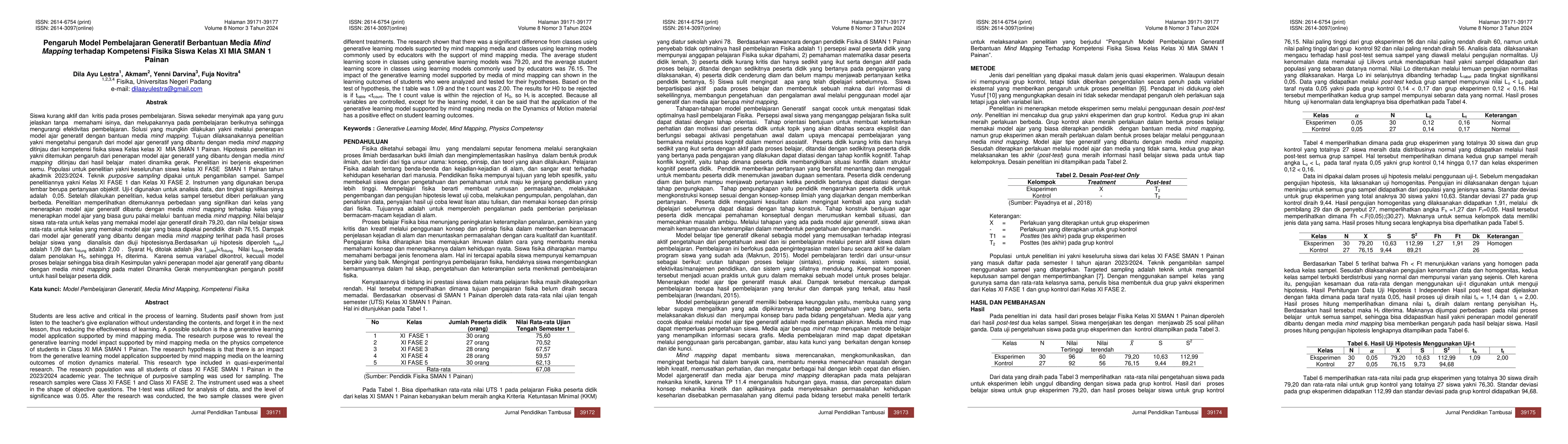 The purpose of this study was to determine the effect of the generative teaching model assisted by mind mapping media in terms of the physics competencies of class XI Science students of Senior High School 1 Painan. This study is a quasi-experimental type. The population for the study was all class XI students of Senior High School 1 Painan. Purposive sampling technique was used for sampling. The research samples were Class A and Class B. The instrument used was an objective question sheet. The t-test was used to analyze the data, and the significance level was 0.05. The study showed a significant difference between classes that implemented the generative teaching model assisted by mind mapping media and classes that implemented the teaching model commonly used by teachers through the help of mind mapping media. The average student learning score for classes using the generative teaching model was 79.20, and the average student learning score for classes using the teaching model commonly used by educators was 76.15. The impact of the generative teaching model assisted by mind mapping media was seen in the results of the student learning process, which were analyzed and the hypothesis was tested. Based on the hypothesis test, the t table was 1.09 and the t count was 2.00. The condition for H0 to be rejected is if ttable lest than tcount. The t count value is in the rejection of H0. Because all variables are controlled, except for the learning process model, it can be achieved. The conclusion is that the application of the generative teaching model assisted by mind mapping media on the Dynamics of Motion material contributes a positive influence to student learning outcomes.