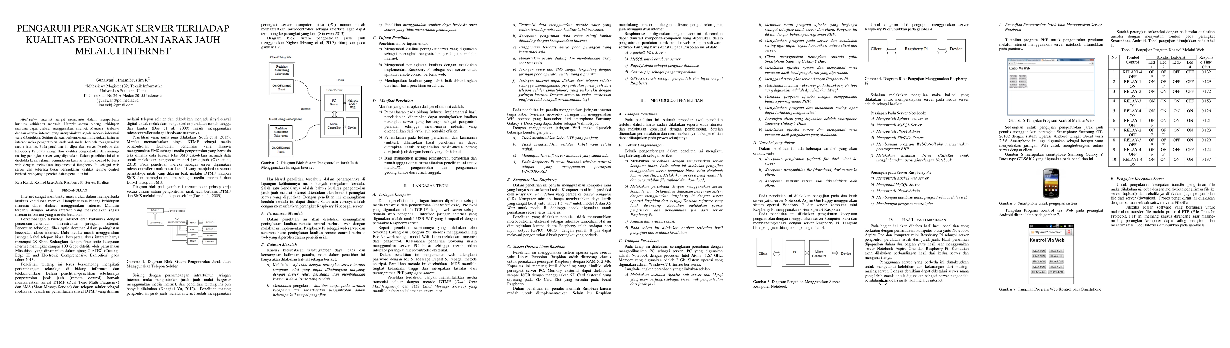 Internet greatly assist people in improving their quality of life. Almost all areas of human life can be accessed using the internet. Human aided by the internet that provides all sorts of information that they need. Along with the development of the Internet network infrastructure remotely control began to change using the internet. In this study using notebooks and servers Raspberry Pi to find out the quality control of each device server used. In this study we investigate the possibility of improving the quality of web-based remote control to implement Raspberry Pi as a web server and how much improvement the quality of web-based remote control obtained in this research.