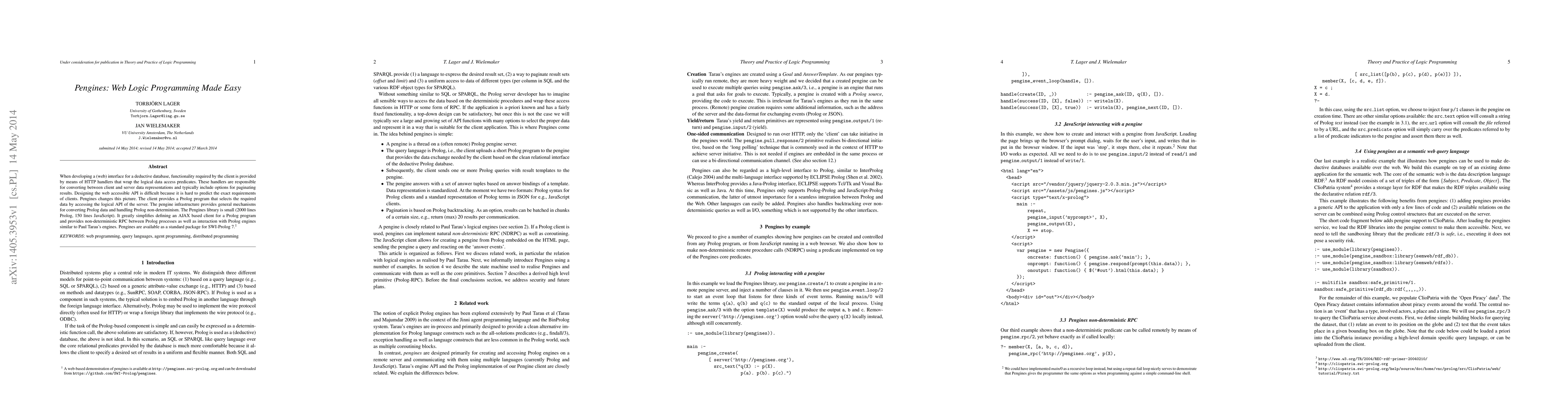 When developing a (web) interface for a deductive database, functionality required by the client is provided by means of HTTP handlers that wrap the logical data access predicates. These handlers are responsible for converting between client and server data representations and typically include options for paginating results. Designing the web accessible API is difficult because it is hard to predict the exact requirements of clients. Pengines changes this picture. The client provides a Prolog program that selects the required data by accessing the logical API of the server. The pengine infrastructure provides general mechanisms for converting Prolog data and handling Prolog non-determinism. The Pengines library is small (2000 lines Prolog, 150 lines JavaScript). It greatly simplifies defining an AJAX based client for a Prolog program and provides non-deterministic RPC between Prolog processes as well as interaction with Prolog engines similar to Paul Tarau's engines. Pengines are available as a standard package for SWI-Prolog 7.