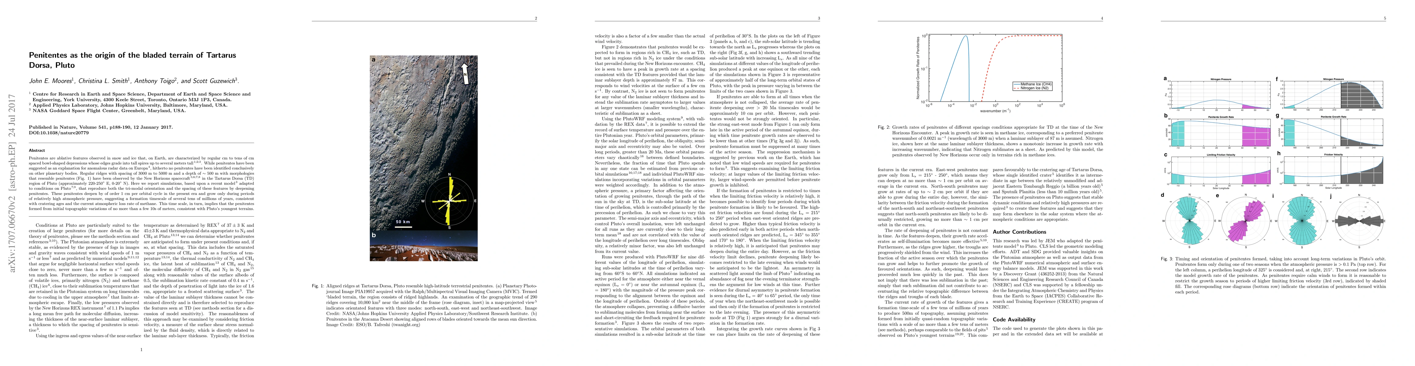 Penitentes are ablative features observed in snow and ice that, on Earth, are characterized by regular cm to tens of cm spaced bowl-shaped depressions whose edges grade into tall spires up to several meters tall (Nichols et al. 1939, Lliboutry et al. 1954, Claudin et al. 2015). While penitentes have been suggested as an explanation for anomalous radar data on Europa (Hobley et al. 2013), hitherto no penitentes have been identified conclusively on other planetary bodies. Regular ridges with spacing of 3000 m to 5000 m and a depth of $\sim500$ m with morphologies that resemble penitentes (Fig. 1) have been observed by the New Horizons spacecraft (Moore et al. 2016, Stern et al. 2015, Gladstone et al. 2016, Moore et al. 2017) in the Tartarus Dorsa (TD) region of Pluto (approximately 220-250$^\circ$ E, 0-20$^\circ$ N). Here we report simulations, based upon a recent model (Claudinet al. 2015) adapted to conditions on Pluto (Gladstone et al. 2016, Toigo et al. 2015), that reproduce both the tri-modal orientation and the spacing of these features by deepening penitentes. These penitentes deepen by of order 1 cm per orbital cycle in the present era and grow only during periods of relatively high atmospheric pressure, suggesting a formation timescale of several tens of millions of years, consistent with cratering ages and the current atmospheric loss rate of methane. This time scale, in turn, implies that the penitentes formed from initial topographic variations of no more than a few 10s of meters, consistent with Pluto's youngest terrains.