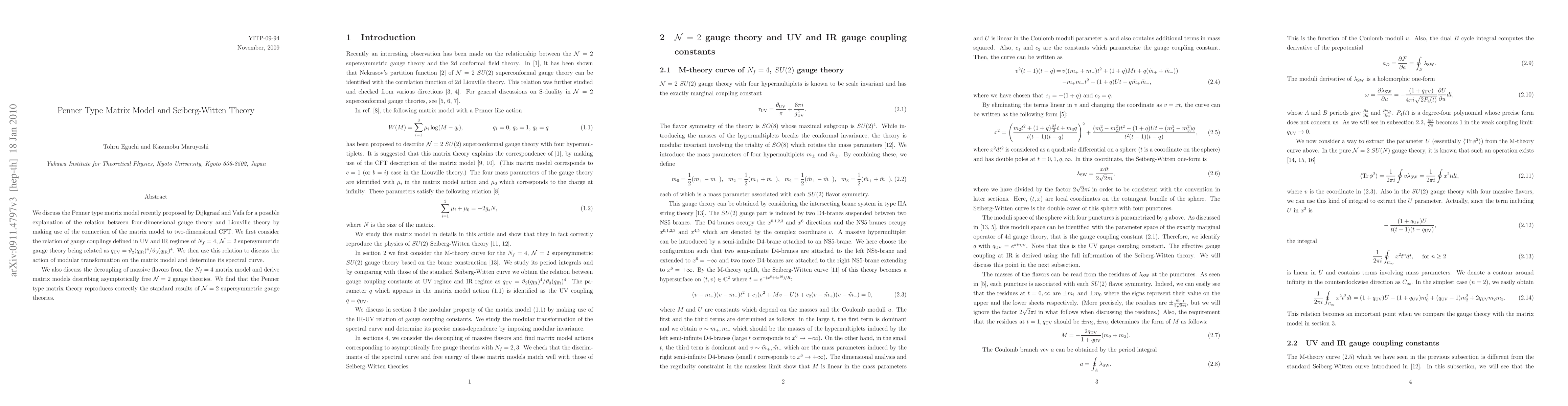 We discuss the Penner type matrix model recently proposed by Dijkgraaf and Vafa for a possible explanation of the relation between four-dimensional gauge theory and Liouville theory by making use of the connection of the matrix model to two-dimensional CFT. We first consider the relation of gauge couplings defined in UV and IR regimes of N_f = 4, N = 2 supersymmetric gauge theory being related as $q_{{\rm UV}}={\vartheta_2(q_{{\rm IR}})^4/\vartheta_3(q_{{\rm IR}})^4}$. We then use this relation to discuss the action of modular transformation on the matrix model and determine its spectral curve. We also discuss the decoupling of massive flavors from the N_f = 4 matrix model and derive matrix models describing asymptotically free N = 2 gauge theories. We find that the Penner type matrix theory reproduces correctly the standard results of N = 2 supersymmetric gauge theories.