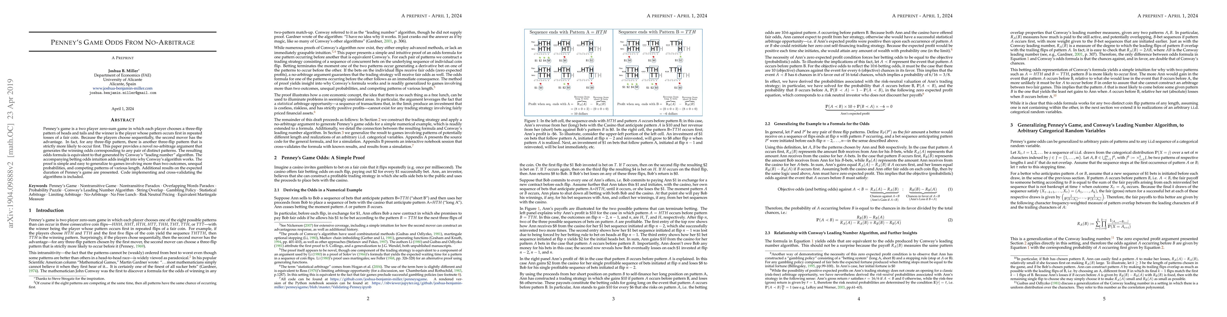 This paper presents a novel no-arbitrage argument to determine the winning odds for any pair of patterns in Penney's game, showing equivalence to Conway's "leading number" algorithm. It also provides insights into the algorithm's effectiveness and extends the results to more complex games.