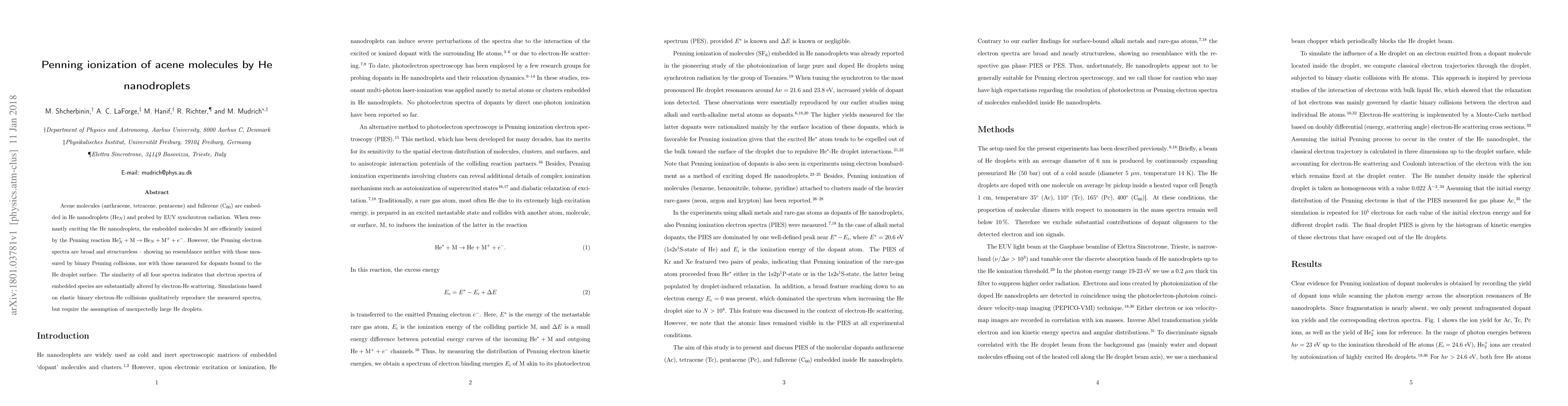 This study investigates the Penning ionization of acene molecules (anthracene, tetracene, pentacene) and fullerene within He nanodroplets using EUV synchrotron radiation, revealing broad, structureless electron spectra due to electron-He scattering. Simulations of the spectra require the assumption of larger He droplets than anticipated.