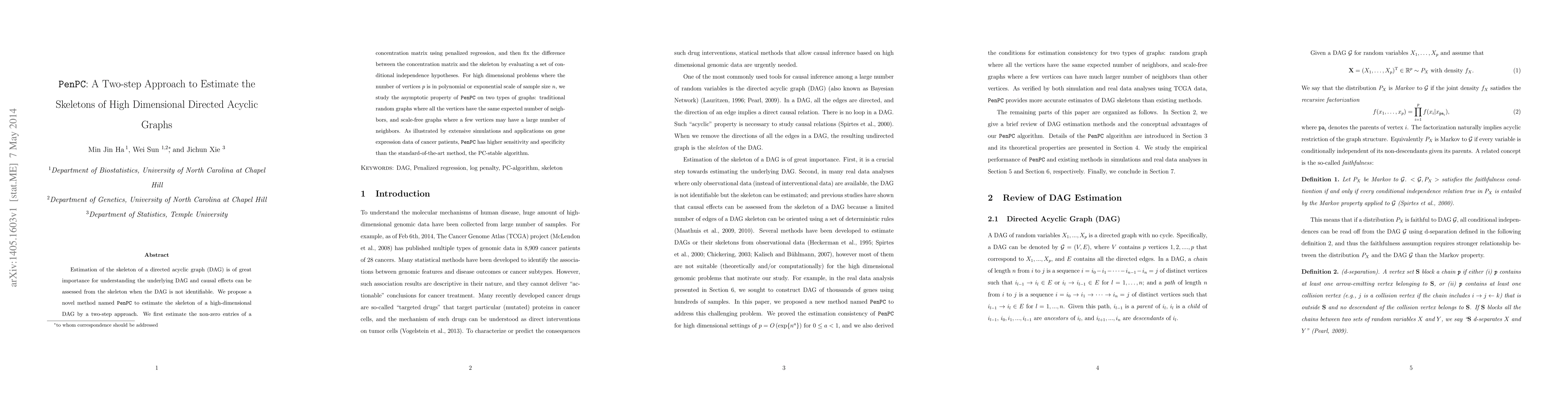 The PenPC method proposes a two-step approach to estimate the skeleton of high-dimensional directed acyclic graphs (DAGs) with improved sensitivity and specificity over existing methods.