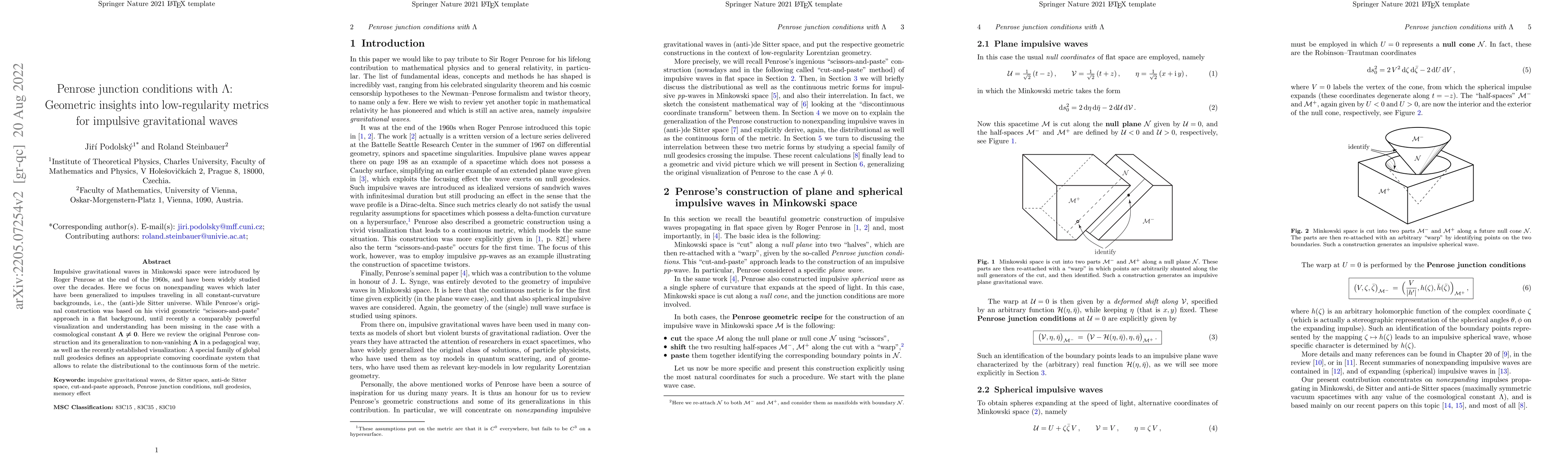 Impulsive gravitational waves in Minkowski space were introduced by Roger Penrose at the end of the 1960s, and have been widely studied over the decades. Here we focus on nonexpanding waves which later have been generalized to impulses traveling in all constant-curvature backgrounds, i.e., the (anti-)de Sitter universe. While Penrose's original construction was based on his vivid geometric "scissors-and-paste" approach in a flat background, until recently a comparably powerful visualization and understanding has been missing in the case with a cosmological constant $\Lambda\not=0$. Here we review the original Penrose construction and its generalization to non-vanishing $\Lambda$ in a pedagogical way, as well as the recently established visualization: A special family of global null geodesics defines an appropriate comoving coordinate system that allows to relate the distributional to the continuous form of the metric.