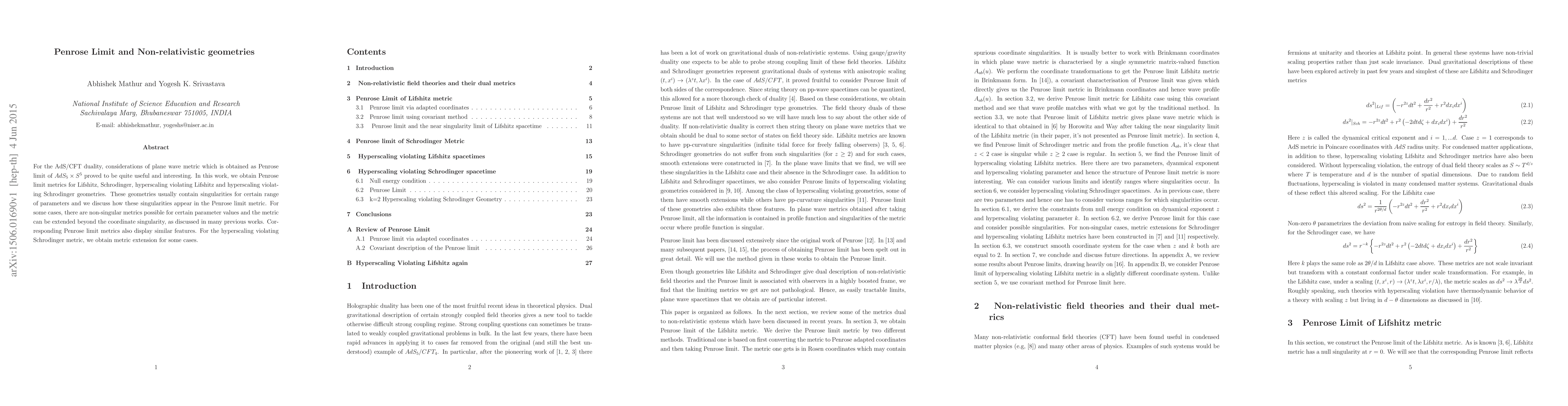 This paper explores the Penrose limit of various non-relativistic geometries, including Lifshitz, Schrödinger, and their hyperscaling violating variants, revealing how singularities manifest in these metrics and discussing the possibility of non-singular extensions for certain parameters.