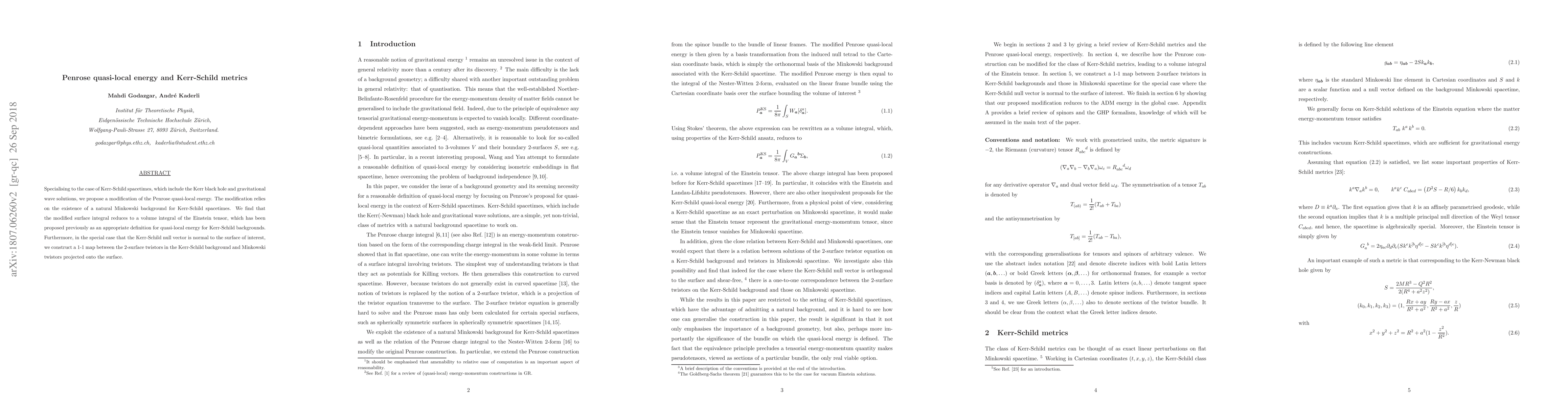 The paper specializes to Kerr-Schild spacetimes, proposing a modification of the Penrose quasi-local energy using a natural Minkowski background. It demonstrates that the modified surface integral reduces to a volume integral of the Einstein tensor.
