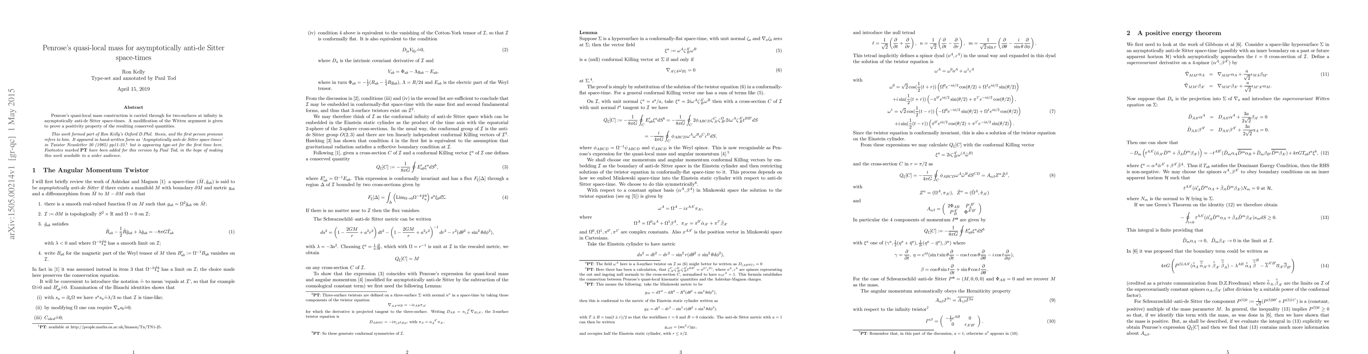 Penrose's quasi-local mass is extended to asymptotically anti-de Sitter space-times for surfaces at infinity, and a modified Witten argument establishes the positivity of the resulting conserved quantities. This work, originally part of Ron Kelly's Oxford D.Phil. thesis, is now type-set with additional footnotes for broader accessibility.
