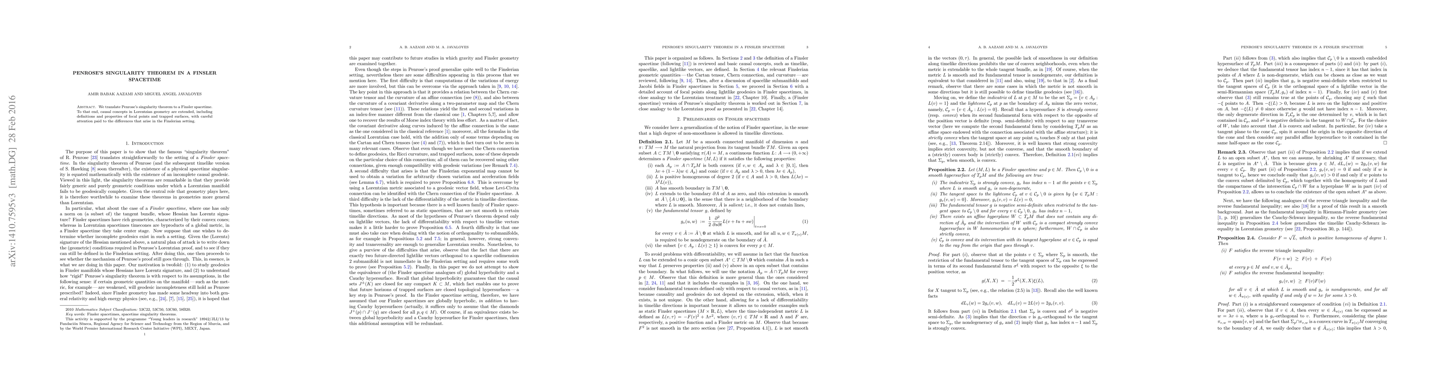 This paper extends Penrose's singularity theorem to Finsler spacetimes, adapting causal concepts from Lorentzian geometry, and examines focal points and trapped surfaces, highlighting the unique characteristics of Finslerian geometry.
