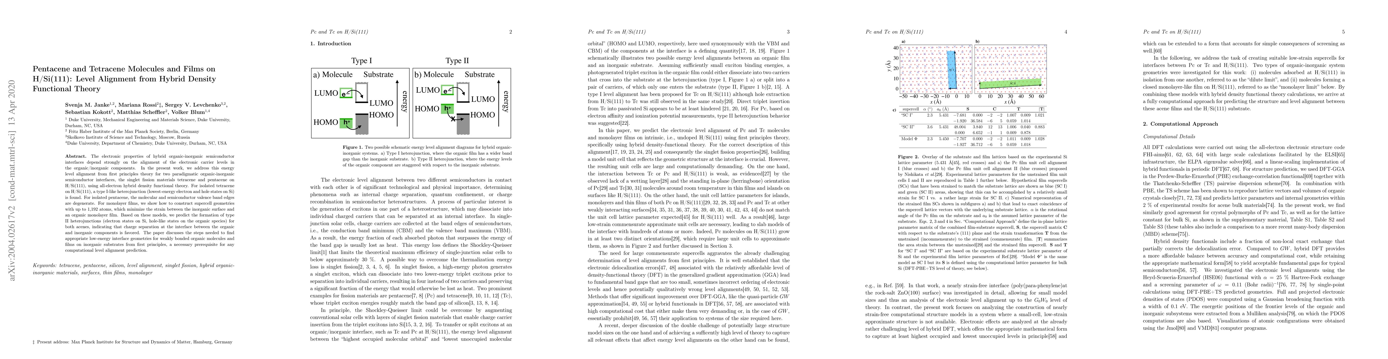 The study employs hybrid density functional theory to analyze the electronic properties of tetracene and pentacene molecules and films on H/Si(111) interfaces, determining energy level alignments through first-principles calculations.