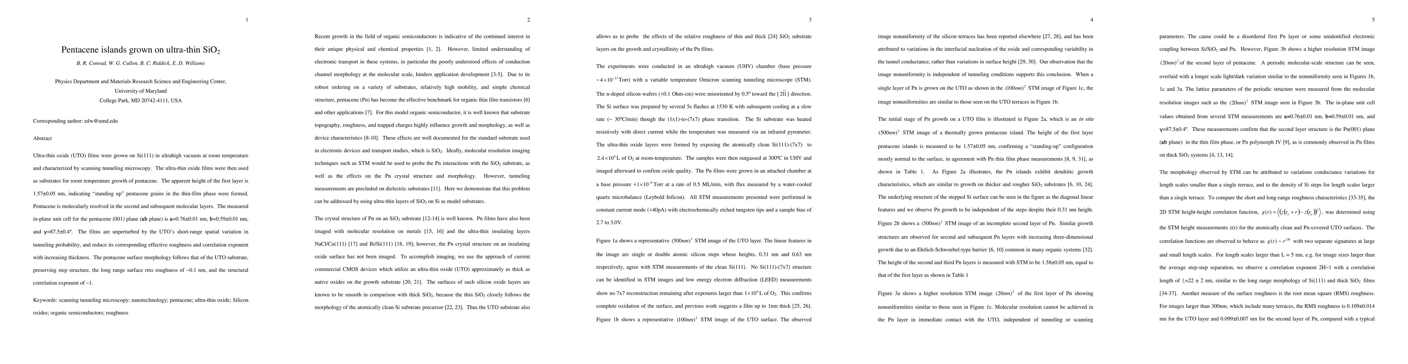 Ultra-thin oxide (UTO) films were grown on Si(111) in ultrahigh vacuum at room temperature and characterized by scanning tunneling microscopy. The ultra-thin oxide films were then used as substrates for room temperature growth of pentacene. The apparent height of the first layer is 1.57 +/- 0.05 nm, indicating standing up pentacene grains in the thin-film phase were formed. Pentacene is molecularly resolved in the second and subsequent molecular layers. The measured in-plane unit cell for the pentacene (001) plane (ab plane) is a=0.76+/-0.01 nm, b=0.59+/-0.01 nm, and gamma=87.5+/-0.4 degrees. The films are unperturbed by the UTO's short-range spatial variation in tunneling probability, and reduce its corresponding effective roughness and correlation exponent with increasing thickness. The pentacene surface morphology follows that of the UTO substrate, preserving step structure, the long range surface rms roughness of ~0.1 nm, and the structural correlation exponent of ~1.