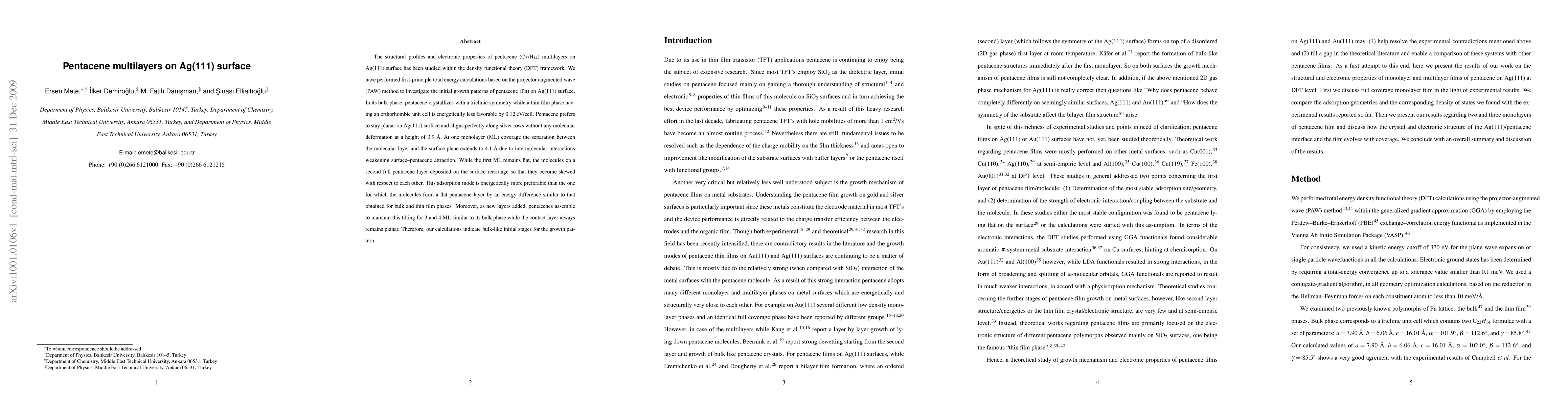 The study uses density functional theory to explore pentacene multilayers on Ag(111), revealing that pentacene molecules remain planar and align along silver rows without deformation at 3.9 Å height, while subsequent layers tilt due to intermolecular interactions, mimicking bulk pentacene growth patterns.