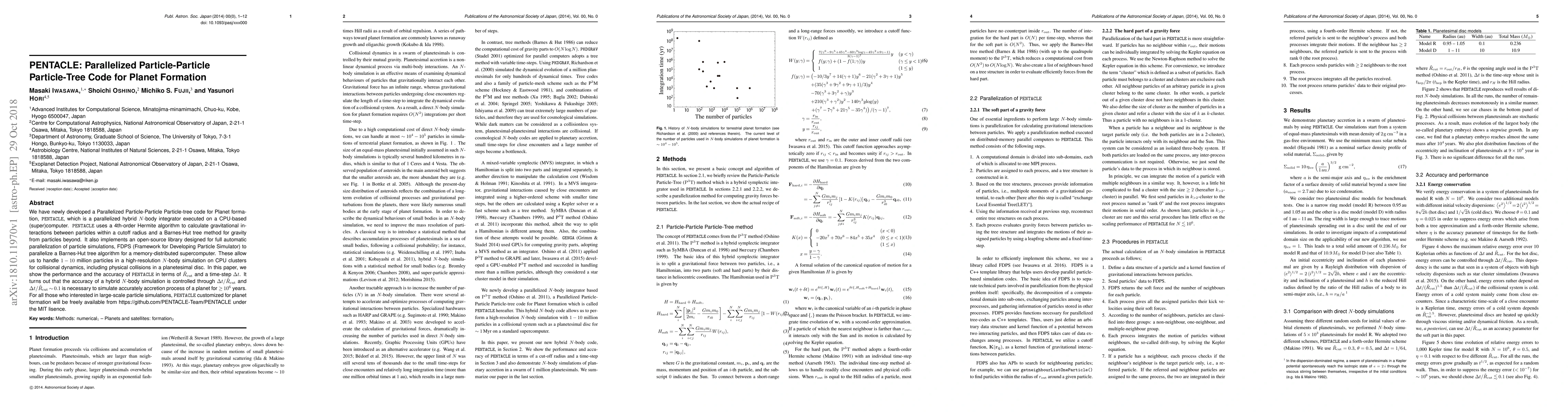 PENTACLE is a parallelized hybrid $N$-body code developed for planet formation simulations, utilizing a 4th-order Hermite algorithm and a Barnes-Hut tree method. It achieves high-resolution simulations of up to $10$ million particles on CPU clusters, ensuring accurate planet accretion processes over $10^6$ years.