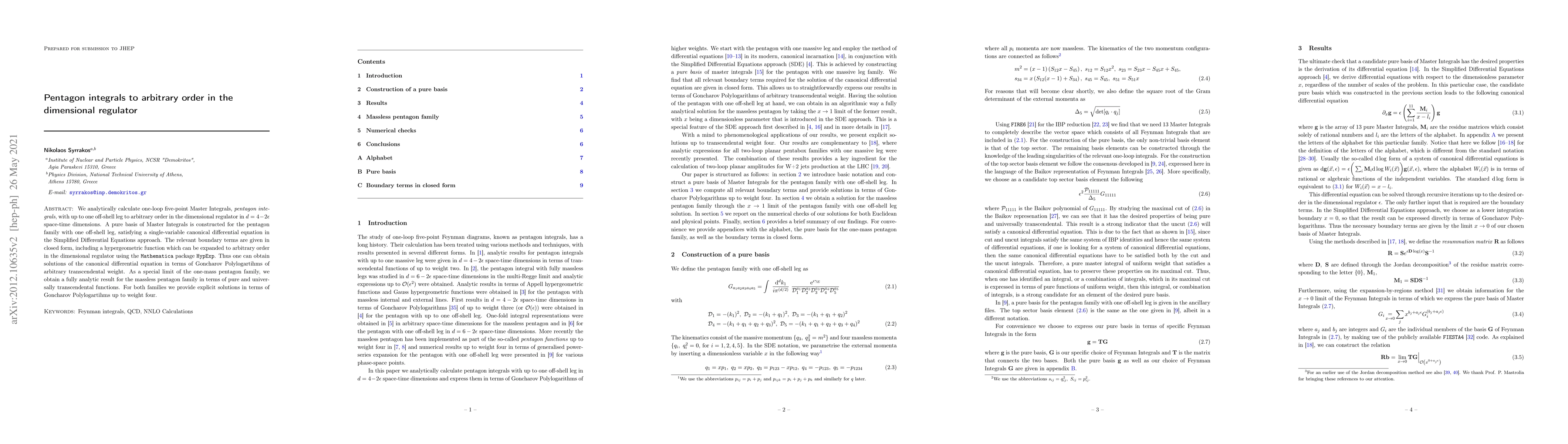 We analytically calculate one-loop five-point Master Integrals, \textit{pentagon integrals}, with up to one off-shell leg to arbitrary order in the dimensional regulator in $d=4-2\epsilon$ space-time dimensions. A pure basis of Master Integrals is constructed for the pentagon family with one off-shell leg, satisfying a single-variable canonical differential equation in the Simplified Differential Equations approach. The relevant boundary terms are given in closed form, including a hypergeometric function which can be expanded to arbitrary order in the dimensional regulator using the \texttt{Mathematica} package \texttt{HypExp}. Thus one can obtain solutions of the canonical differential equation in terms of Goncharov Polylogartihms of arbitrary transcendental weight. As a special limit of the one-mass pentagon family, we obtain a fully analytic result for the massless pentagon family in terms of pure and universally transcendental functions. For both families we provide explicit solutions in terms of Goncharov Polylogartihms up to weight four.